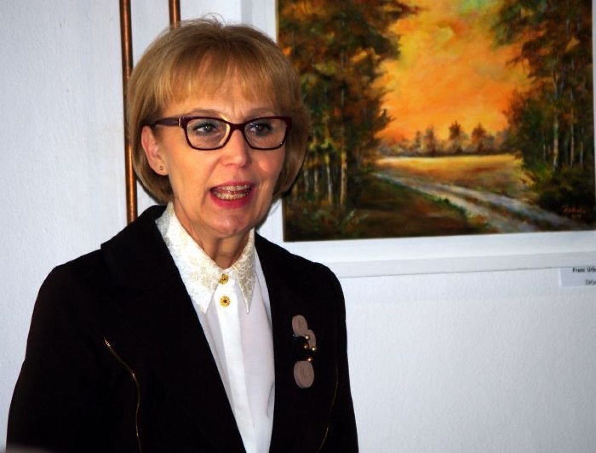 Slavka Kristan, v ozadju slika dveh novomeških umetnikov, na desni abeceda odličnosti ter spredaj knjižna bera literarne sekcije DU Snovanja.