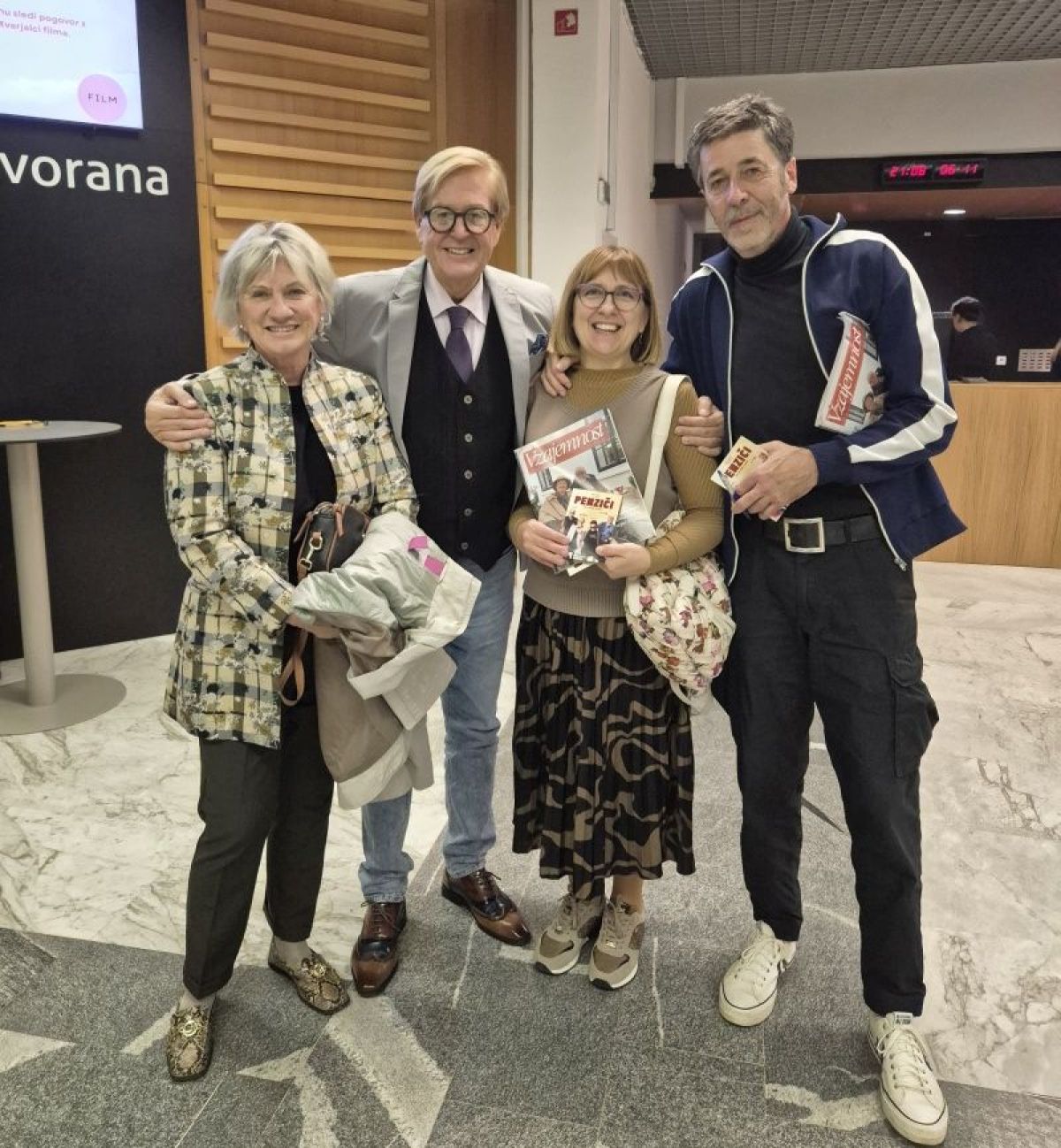 Po predstavi so se vsi štirje humoristi pomešali še med obiskovalce in se fotografirali kot pravi zvezdniki. Na objavljeni fotografiji sta z Jako Šraufcigerjem in Kekom novinarka Lidija Jež (na fotografiji levo), ki je občasno pisala tudi za Dolenjski list, in urednica revije Vzajemnost Jožica Dorniž, nekoč odgovorna urednica Dolenjskega lista.