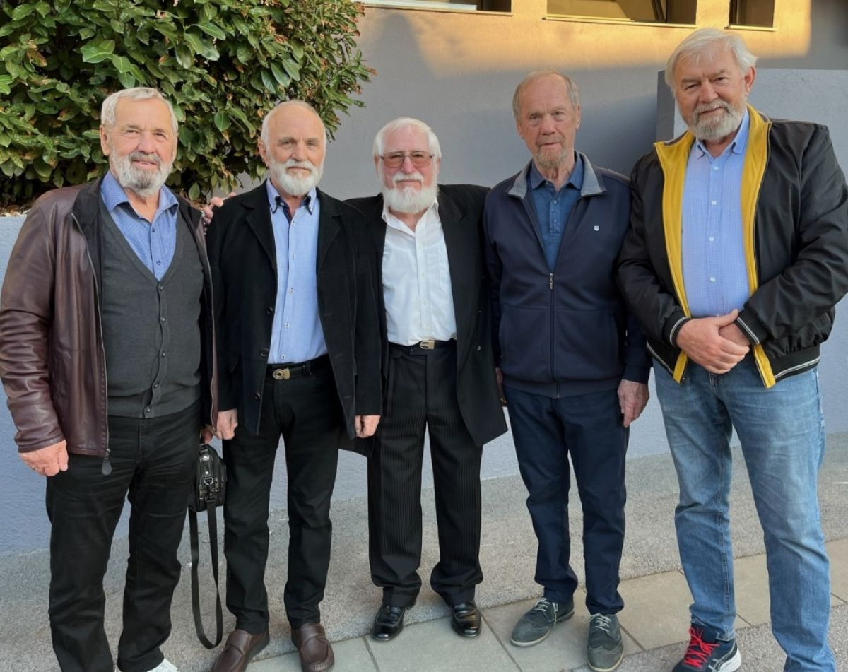 Letošnji Trdinov nagrajenec Tone Jakše (na fotografiji v sredini) je na slovesno podelitev v novomeški Kulturni center Janeza Trdine prišel v družbi družine in številnih prijateljev, med drugim tudi druščine UBB (na fotografiji), na katero ga veže še mladostno prijateljstvo. Da so se z njim veselili (od leve proti desni) Jure Gros, Milan in Štefan Markelj ter Jože Simčič, mu veliko pomeni.