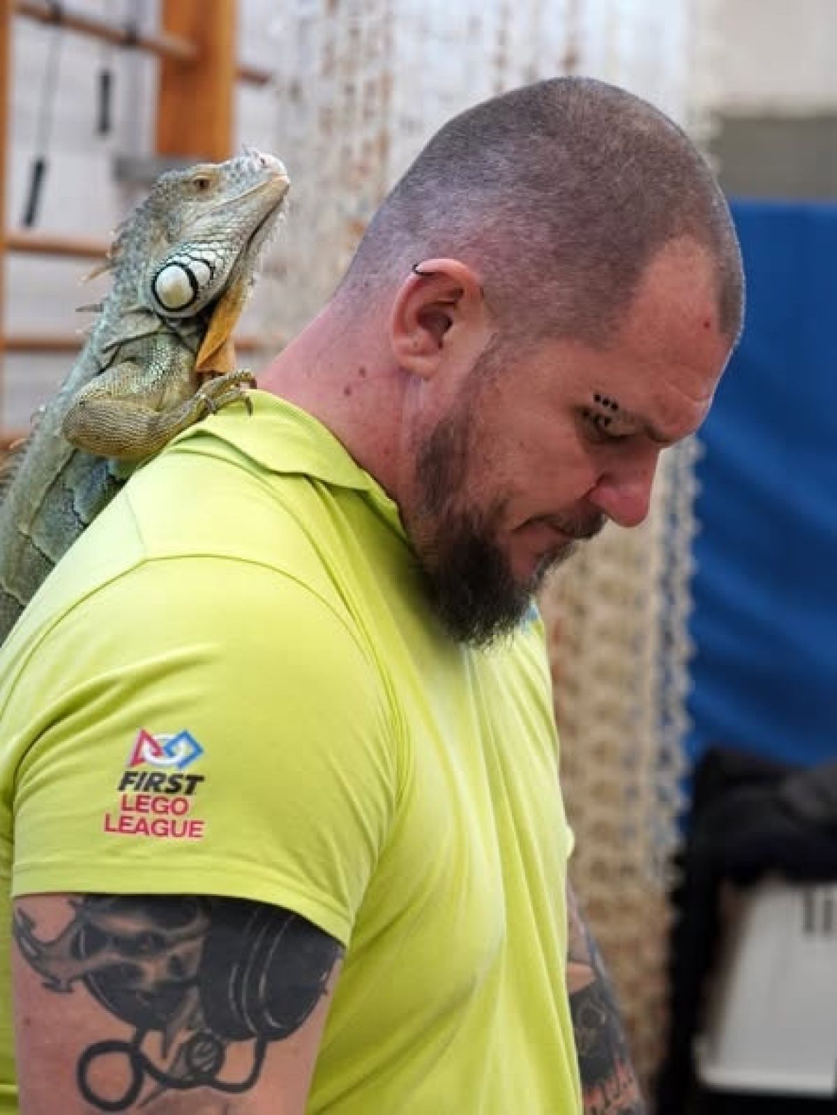Kot stalni del ekipe FLL (First Lego liga), v kateri skrbi za ozvočenje in glasbo, je mlade tekmovalce na nedavnem tekmovanju na OŠ Drska v Novem mestu presenetil s čisto pravim legvanom Marjanom. S hčerko Urško, ki obiskuje veterinarsko šolo, večkrat poskrbita za popestritev dogodkov s kakšnimi eksotičnimi živalmi, ki jih imajo doma.