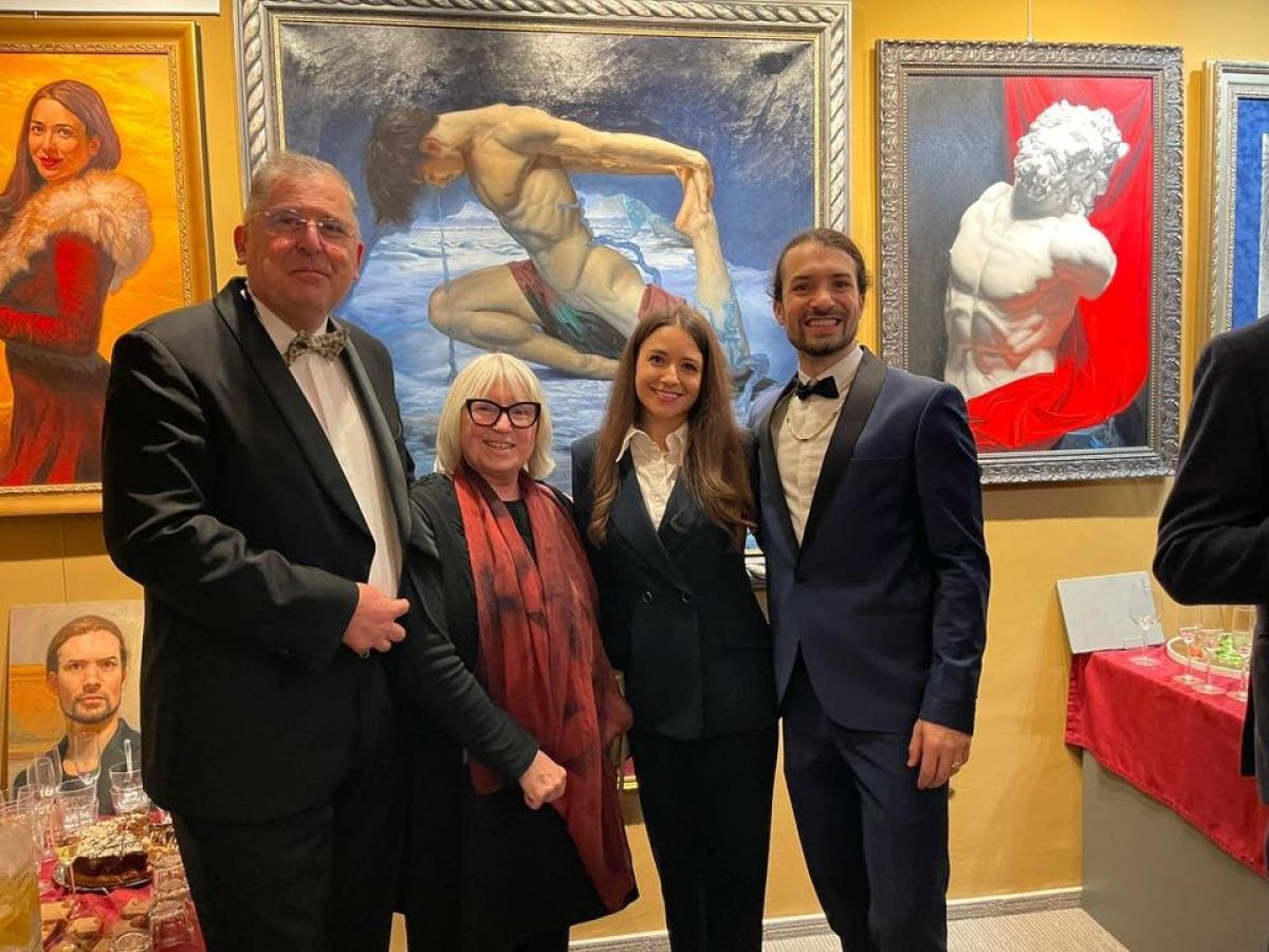 Na fotografiji so ob Niku Anikisu (na fotografiji desno) njegova žena Teodora Tea Ristevska Skušek, doktorica znanosti, ki jo je želja po znanju in širini duha iz rodne Makedonije pripeljala v Slovenijo, ter znan slovenski podjetniški par Aljoša (levo) in Suzana Domijan, lastnika podjetij Gambit trade in Ena a.