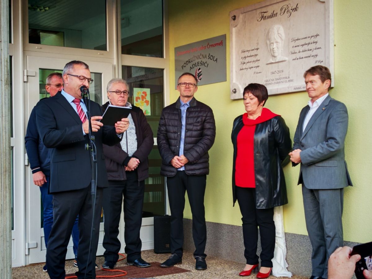 Pred vhodom v podružnico Osnovne šole Loka v Adlešičih so 16. oktobra, na dan, ko bi praznovala 78. rojstni dan, slovesno odkrili spominsko ploščo besedilopiski Faniki Požek (1947–2019), roj. Vlašič, iz Dolencev.