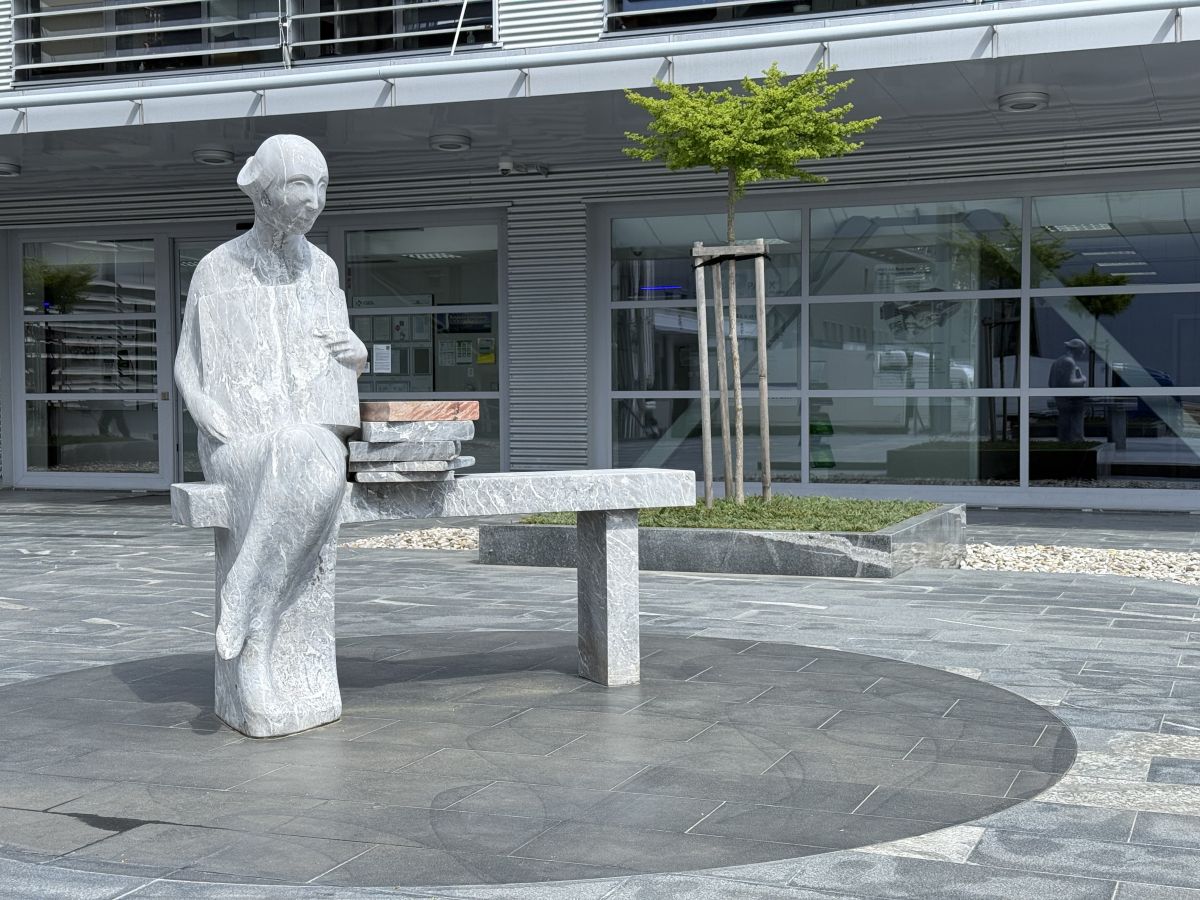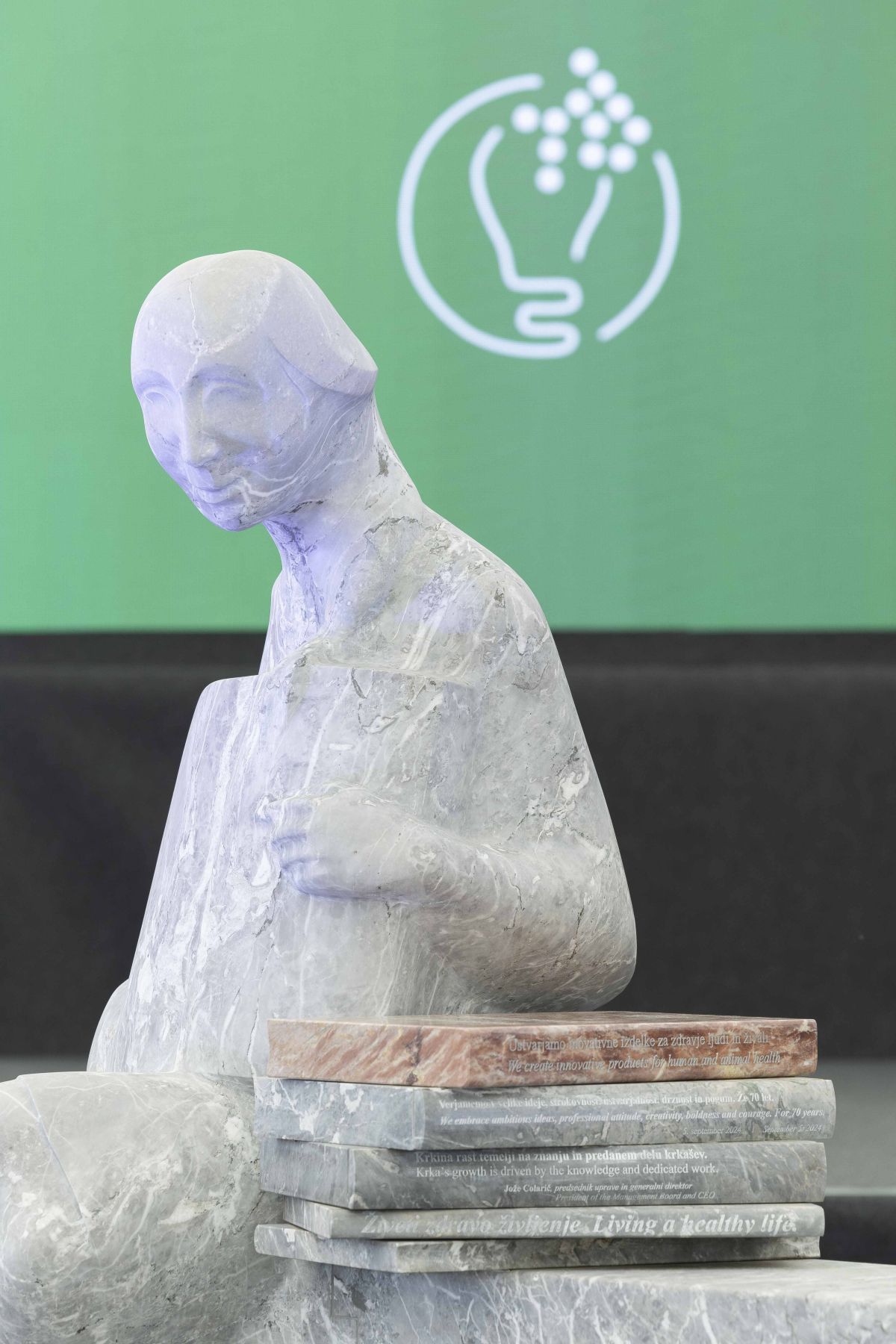 Skulptura akademskega kiparja Jurija Smoleta, ki je edina te vrste v industrijskem okolju, ponazarja razvoj in identiteto Krke kot stalno učečega se podjetja. Krkini deklici z rastočo knjigo ob pomembnih priložnostih simbolno dodajajo nove knjige z mislimi, ki ponazarjajo odnos do izobraževanja, dela, ustvarjalnosti in napredka.