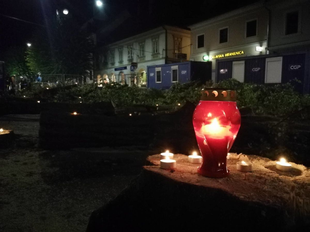 Včeraj so bili števili Novomeščani šokirani, ko so opazovali delavce ob sekanju drevoreda na Glavnem trgu. Da bodo večino obstoječih dreves umaknili oz. jih nadomestili z drugimi v sklopu celovite prenove mestnega jedra, je bilo sicer znano že dlje časa, a včerajšnji posek je marsikoga pustil brez besed, nemalo jeznih zapisov je na družbenih omrežjih. Nekaj Novomeščanov in Novomeščank se je tako sinoči zbralo v centru in v spomin na padlo drevje prižgalo sveče (galerija spodaj).