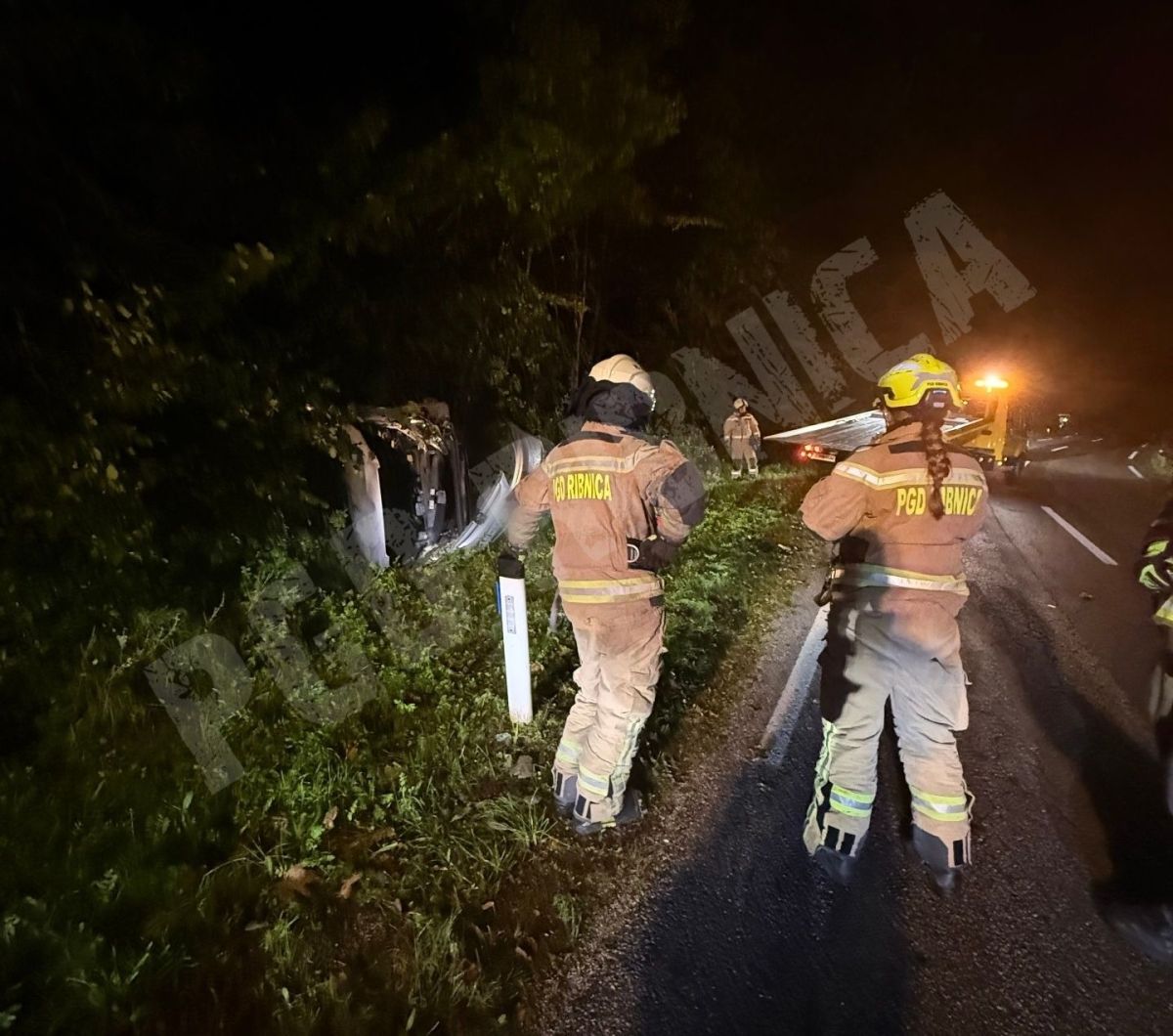 To pa je fotografije nedeljske prometne nesreče v občini Velike Lašče, kjer je osebno vozilo zapeljalo s ceste in obstalo prevrnjeno na bok. Ena oseba se je pri tem lažje poškodovala.