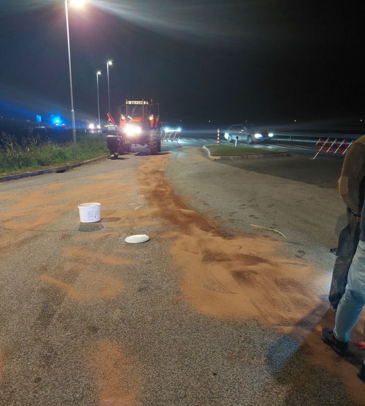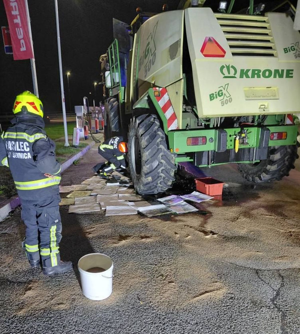 Policija je krške gasilce pospremila v Kerinov Grm, medtem ko so sevniški čistili razlito hidravlično olje iz okvarjenega kmetijskega stroja.