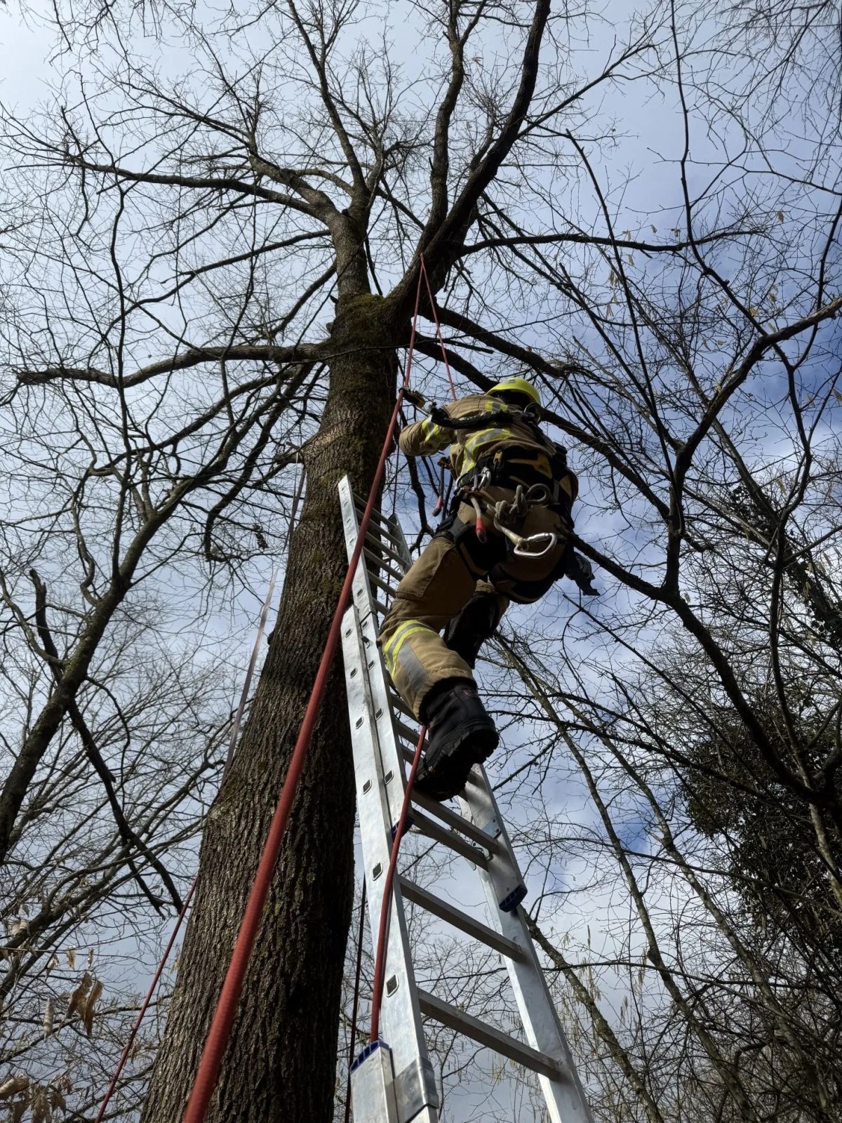 Na kraj dogodka so izvozili z dvema gasilcema. Z uporabo vrvne tehnike je eden od njiju splezal na drevo in mačka rešil z višine približno 10 metrov.