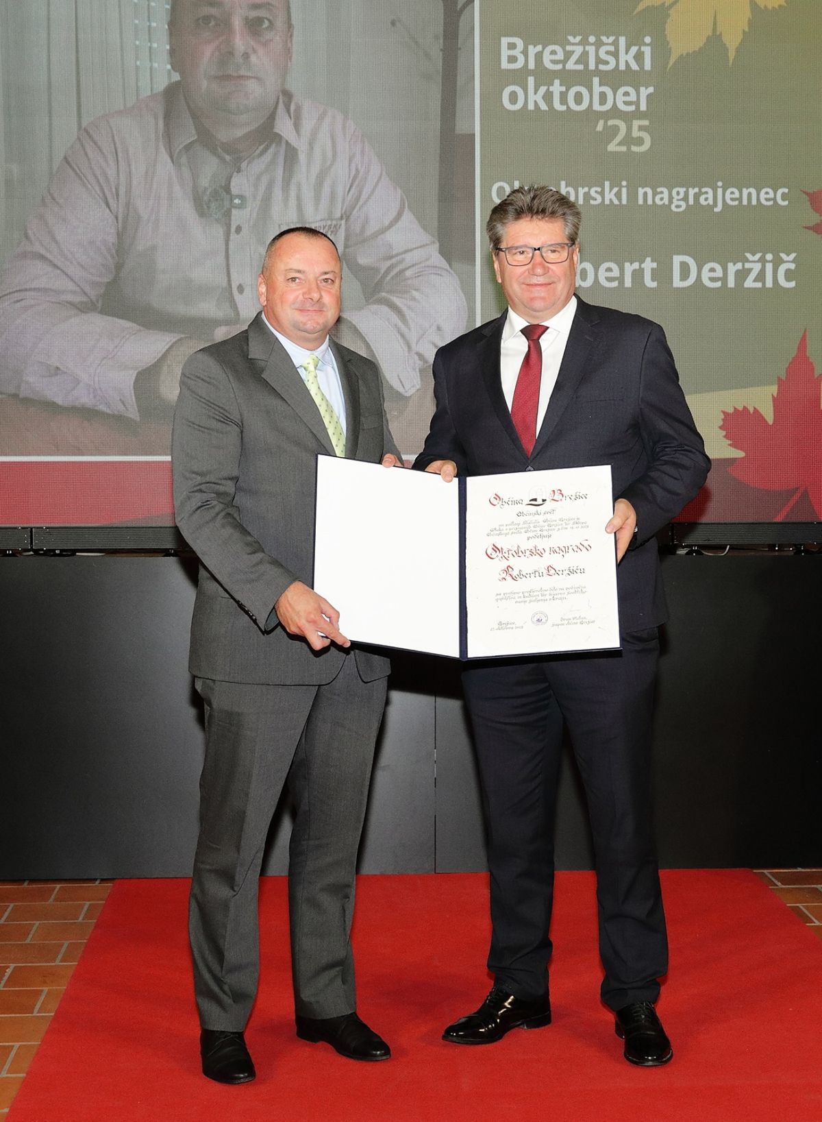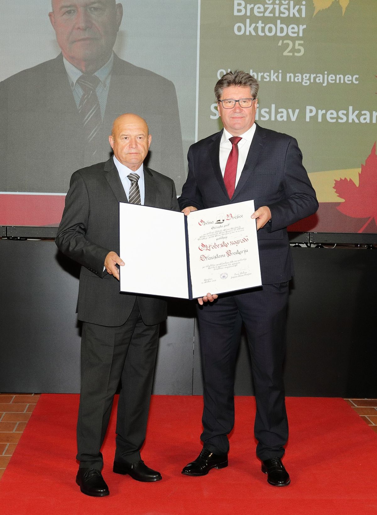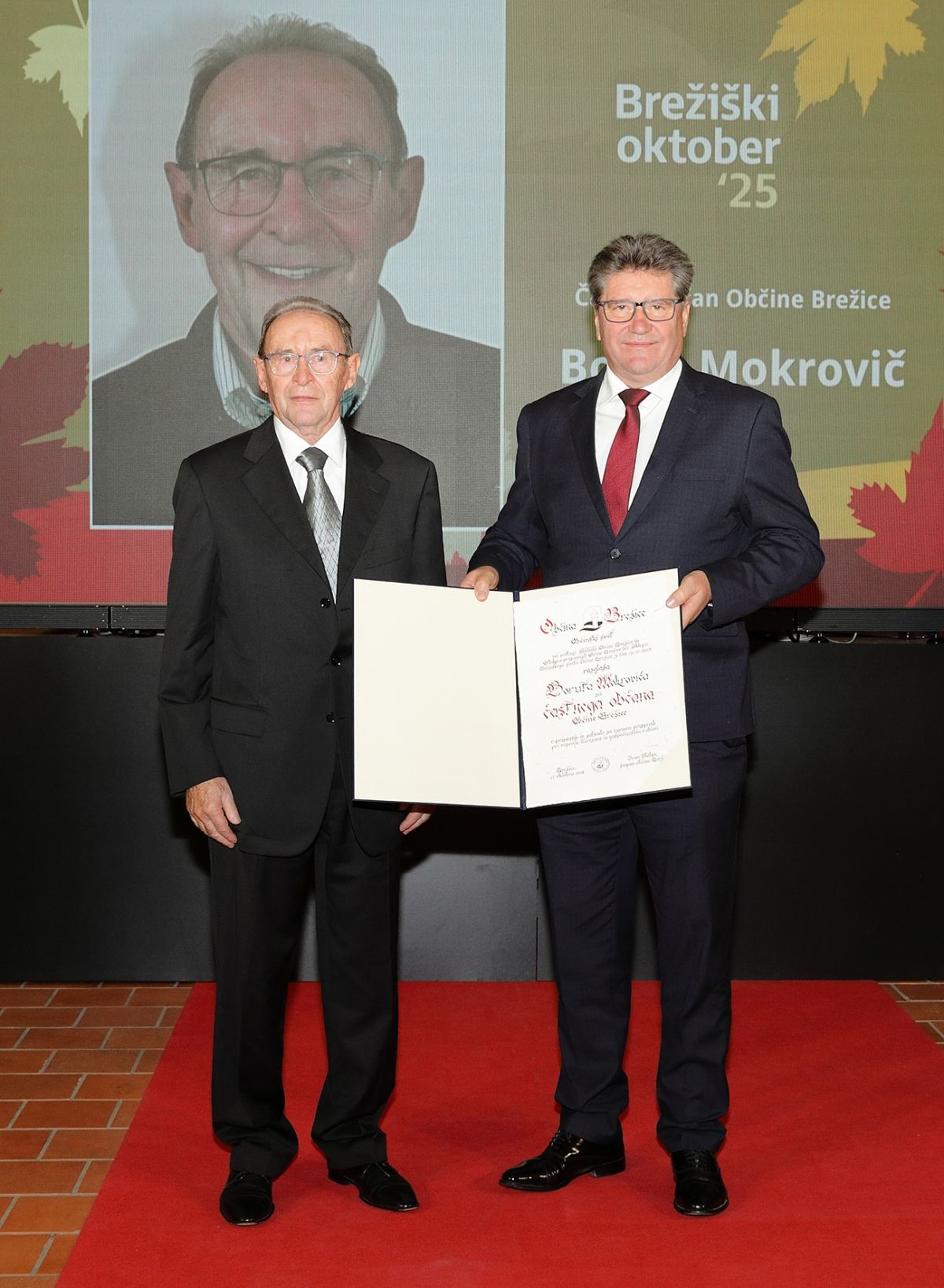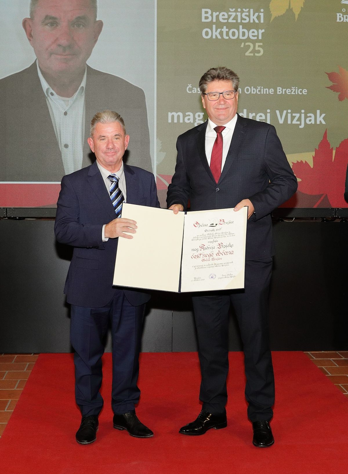 Župan Ivan Molan je izročil listine prejemnikom naziva častni občan, oktobrskih nagrad in priznanj ter plakete. Občina Brežice ima tako dva nova častna občana, to sta Borut Mokrovič in Andrej Vizjak.