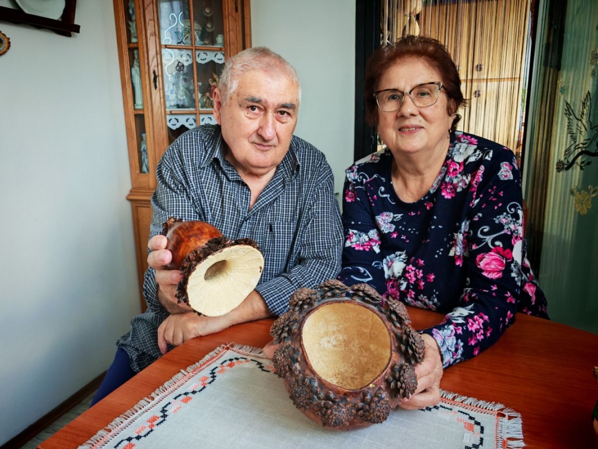 »Sušenje je dolgotrajno, včasih tudi nehvaležno. Vse se ne posušijo. Nekatere počijo, druge zgnijejo, nekatere se uležijo. Ampak tiste, ki preživijo – te so najboljše,« pravi. Buče so najprej rasle na njenem nekdanjem vrtu v Lužinah, kjer sta z Ivico, življenjskim sopotnikom, več let obdelovala zemljo. »Tam je bilo naše kraljestvo – buče, zelje, koruza. Včasih tako velika glava zelja, da so jo fotografirali in kot posebnost objavili v medijih,« Ivica pokaže sliko. Iz posušenih buč Sofija izdeluje prave drobne zaklade: sklede, posode, košare, figure živali, okrasne lučke. »Včasih jo odrežem zgoraj in spodaj, pa se naredi taka posoda, da bi lahko vino ali žgane pijače iz soda prelivali, kot so to počeli naši starši. Tudi Ivica to ve,« pojasni in pokaže skrbno obdelano bučo, ki bi ji lahko rekli kar unikatna naravna keramika.