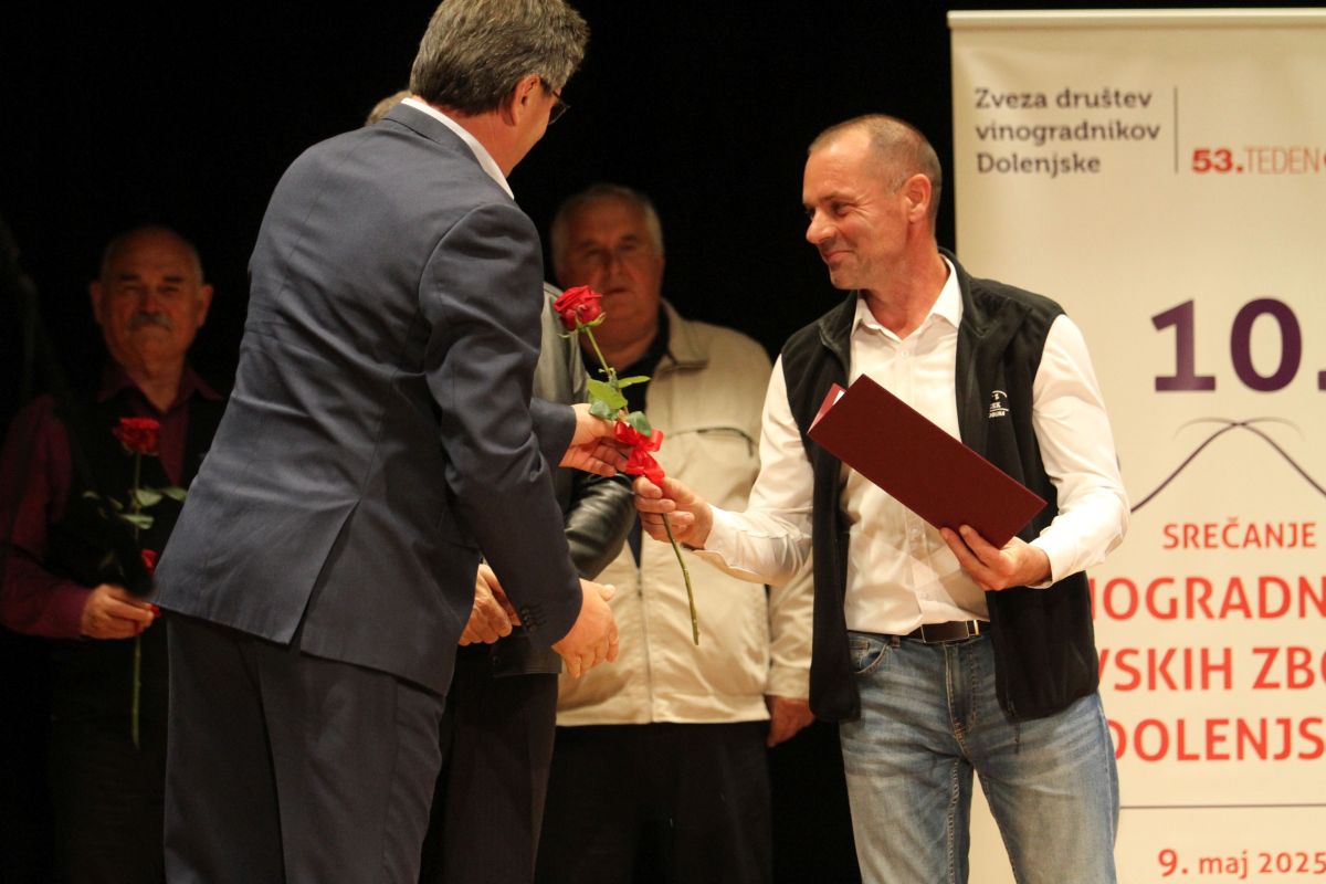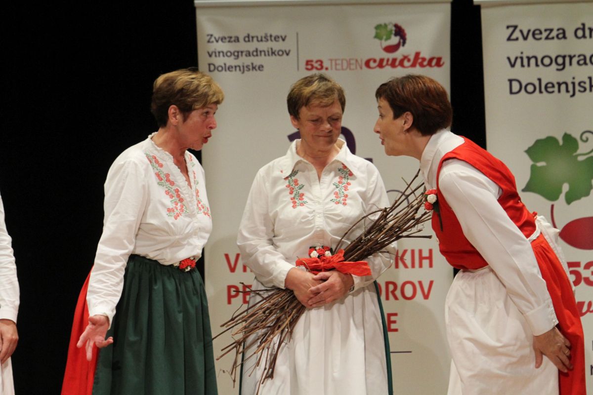Priznanje je med drugim romalo tudi v roke pevcev vinogradniškega društva Šentjanž. »Vsako leto prihajamo v Trebnje, ker je to zelo zanimiva prireditev, posebnost, ki je druge pokrajine nimajo. Smo edini, ki smo vedno prepevali pesmi z vinsko tematiko. Seveda znamo še vrsto drugih. Redno se dobivamo, lani smo se uvrstili med deset najboljših skupin ljudskih pevcev v Sloveniji, na kar smo zelo ponosni. Običajno nas je osem, danes pa sta dva manjkala. Eden zaradi okrevanja po operaciji, drugi zaradi službe. On je še edini, ki hodi v službo, ostali smo že upokojenci. Naš najstarejši član Jože Livk bo letos dopolnil 92 let. Še vedno z veseljem hodi na nastope in vaje,« je povedal vodja skupine Metod Pečar.