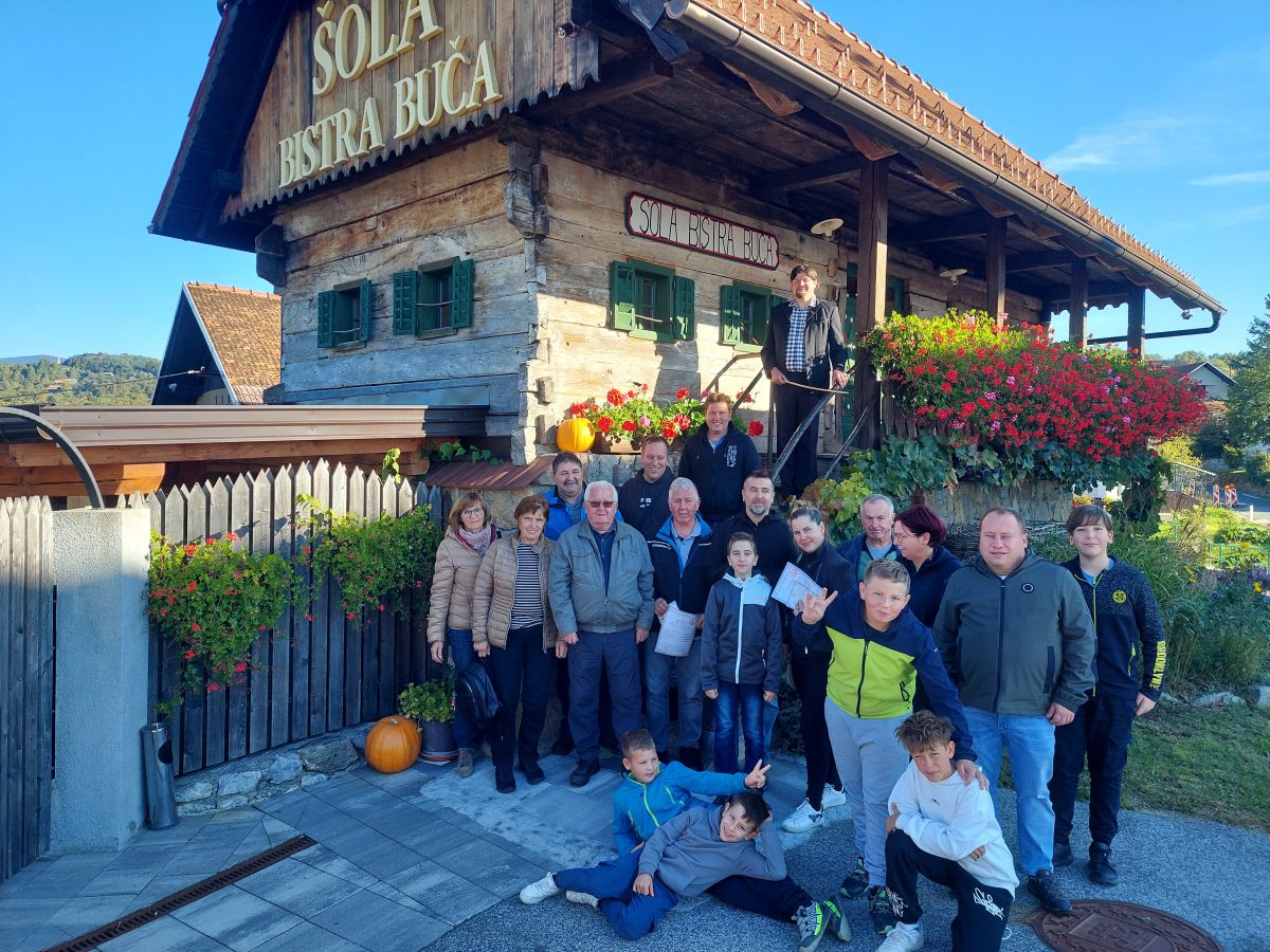 Naša prva postaja je bila stara osnovna šola Bistra buča, kjer smo na zelo izviren, poučen in humorističen način spoznali Belo krajino. Predstavitev je potekala v duhu starih šolskih časov, ob spremljavi »učitelja«, ki nam je predstavil značilnosti pokrajine, pomen njenega imena, tipične belokranjske jedi, običaje in navade tamkajšnjih ljudi. Obisk je bil poln smeha in dobre volje, obenem pa smo se naučili marsikaj novega o belokranjski kulturi in zgodovini.