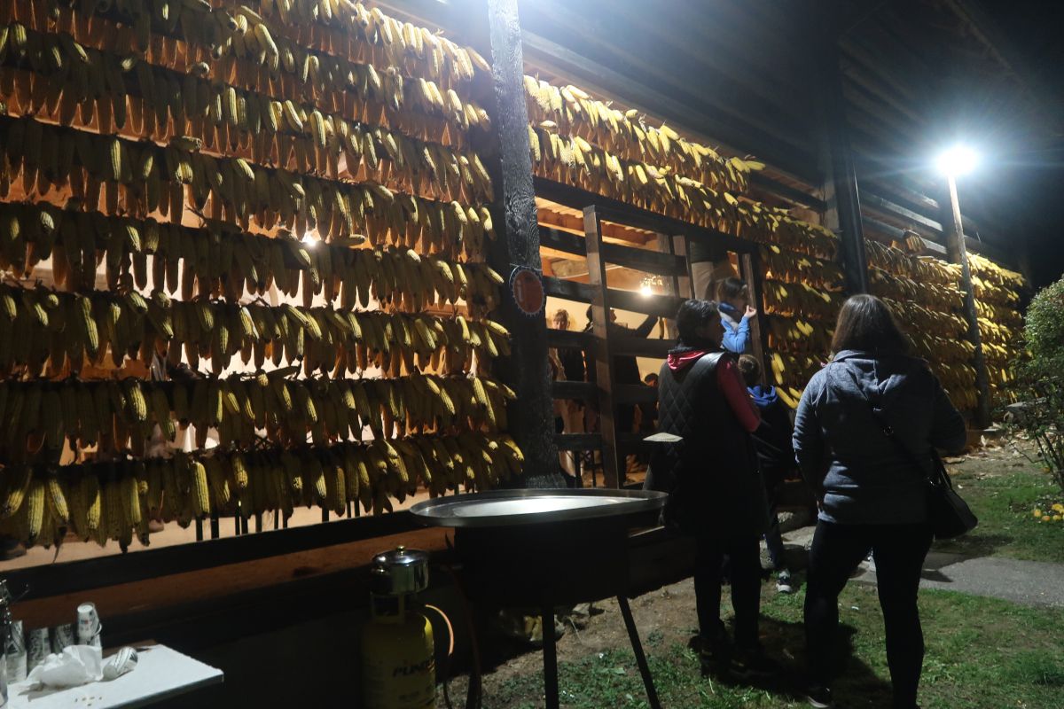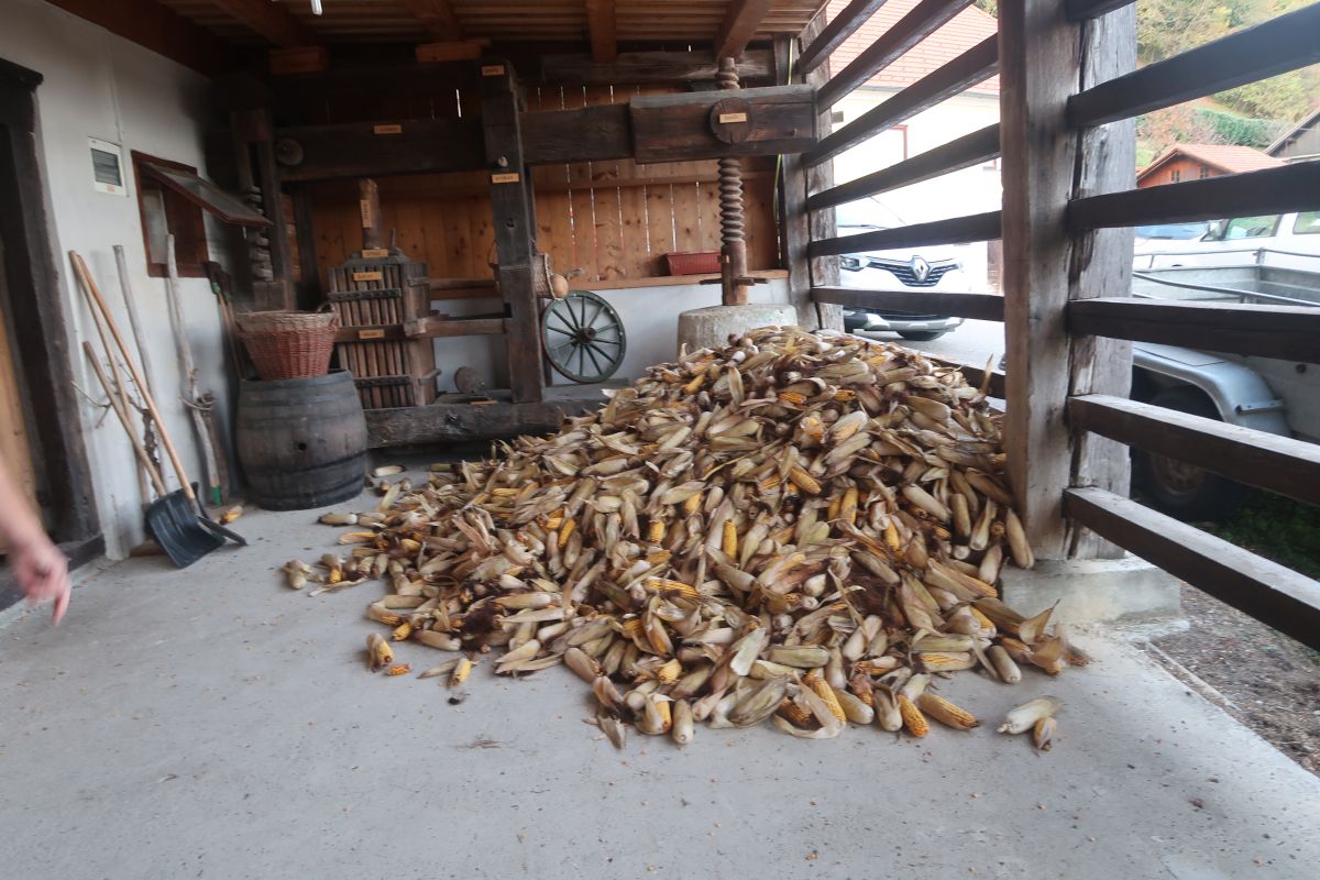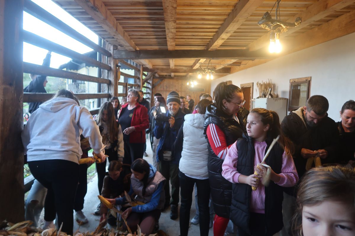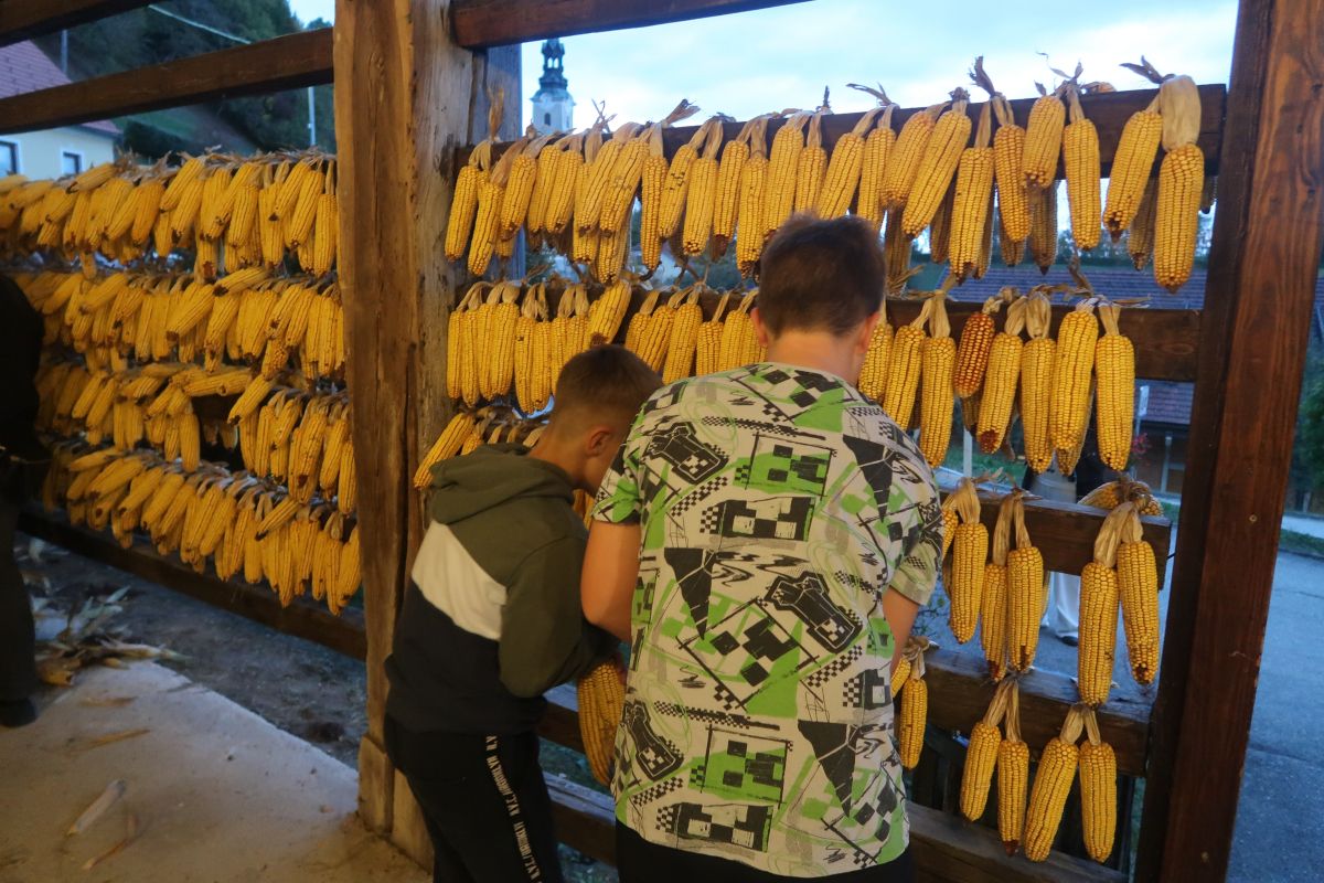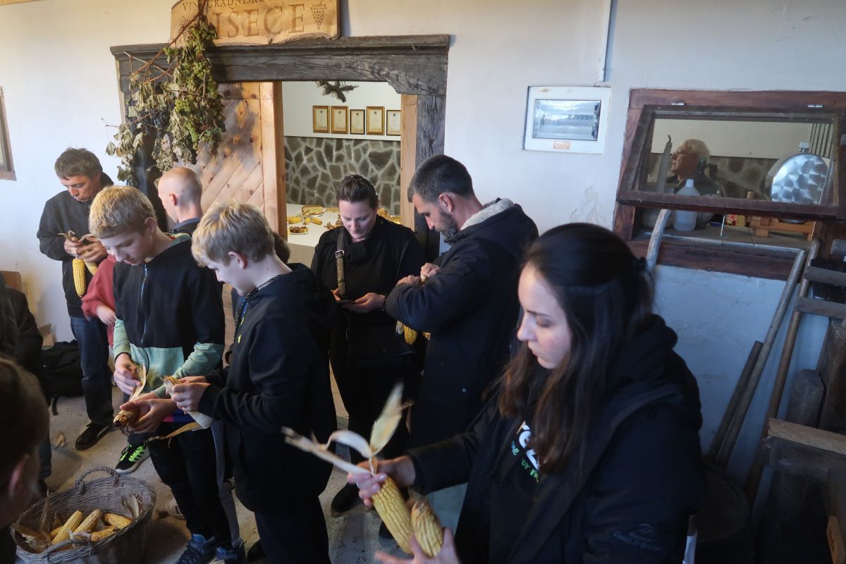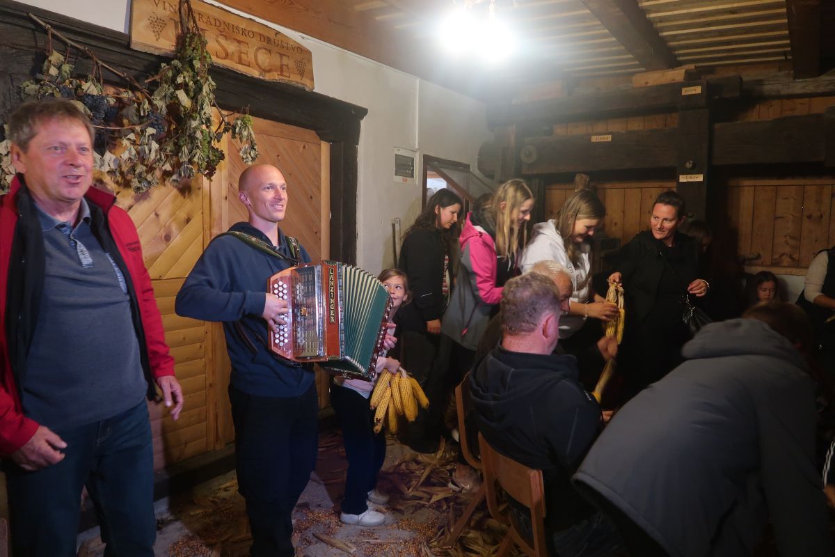 Po uvodnih navodilih goste Anice in ravnateljice Nuške Ogorevc smo se lotili dela, kup koruze je bil kar velik. Ker smo sodelovali vsi, je bil »likof« po dveh urah, ko smo sedli k večerji. Še prej pa nam je učitelj Matjaž zaigral na harmoniko, tako da so nekateri še zaplesali.