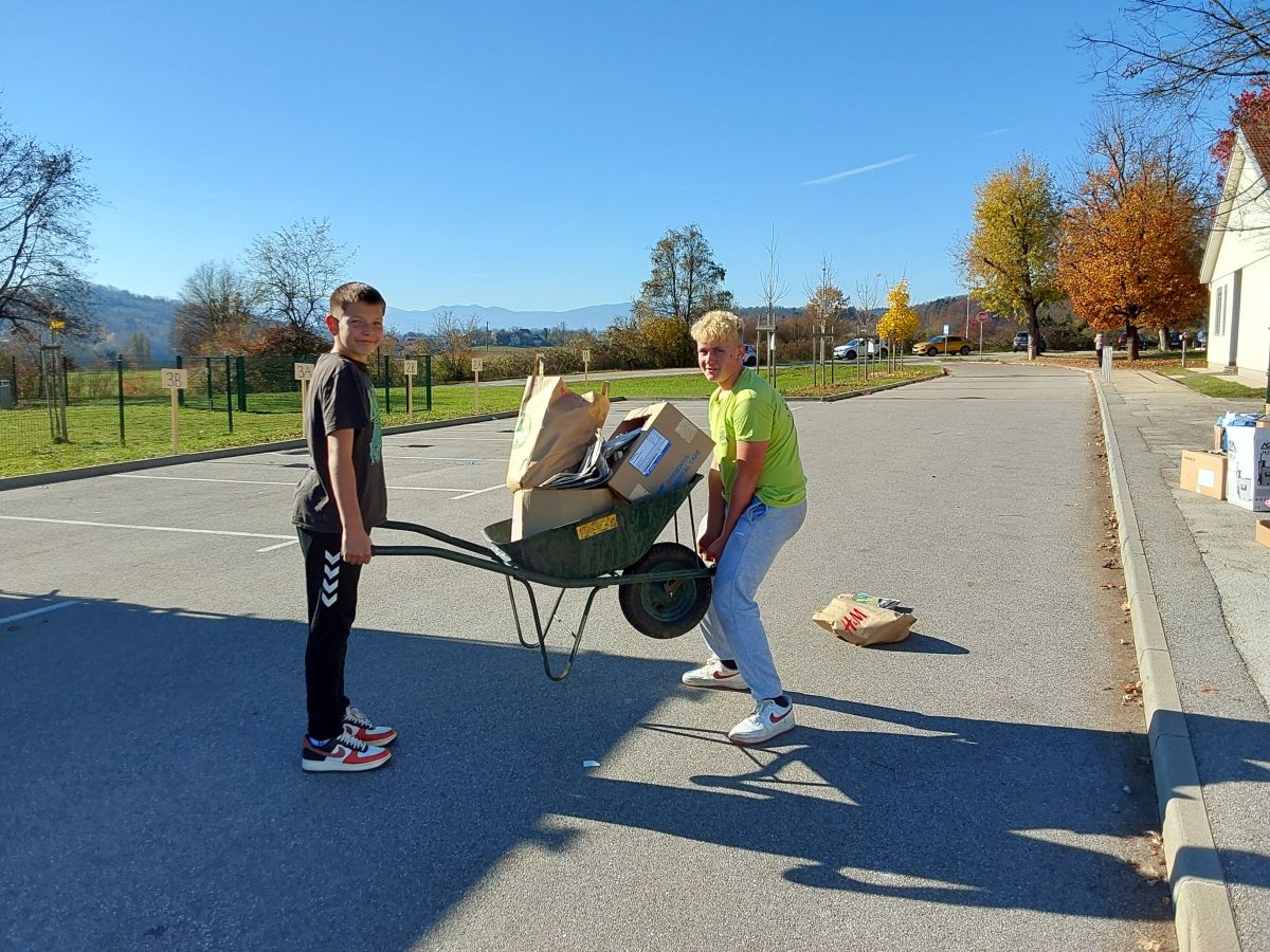Od zgodnjega jutra do poznega popoldneva smo z veliko dobre volje in uporabe mišic pomagali raztovarjati, tehtati ter nalagati papir, ki so ga pripeljali starši, učenci, učitelji in drugi krajani. Med čakanjem na novo pošiljko starega papirja smo se zabavali ob glasbi in teptanju kartonskih škatel. Rezultat je bil zelo dober - šolarji in otroci iz vrtca smo skupaj zbrali več kot 11 ton papirja!