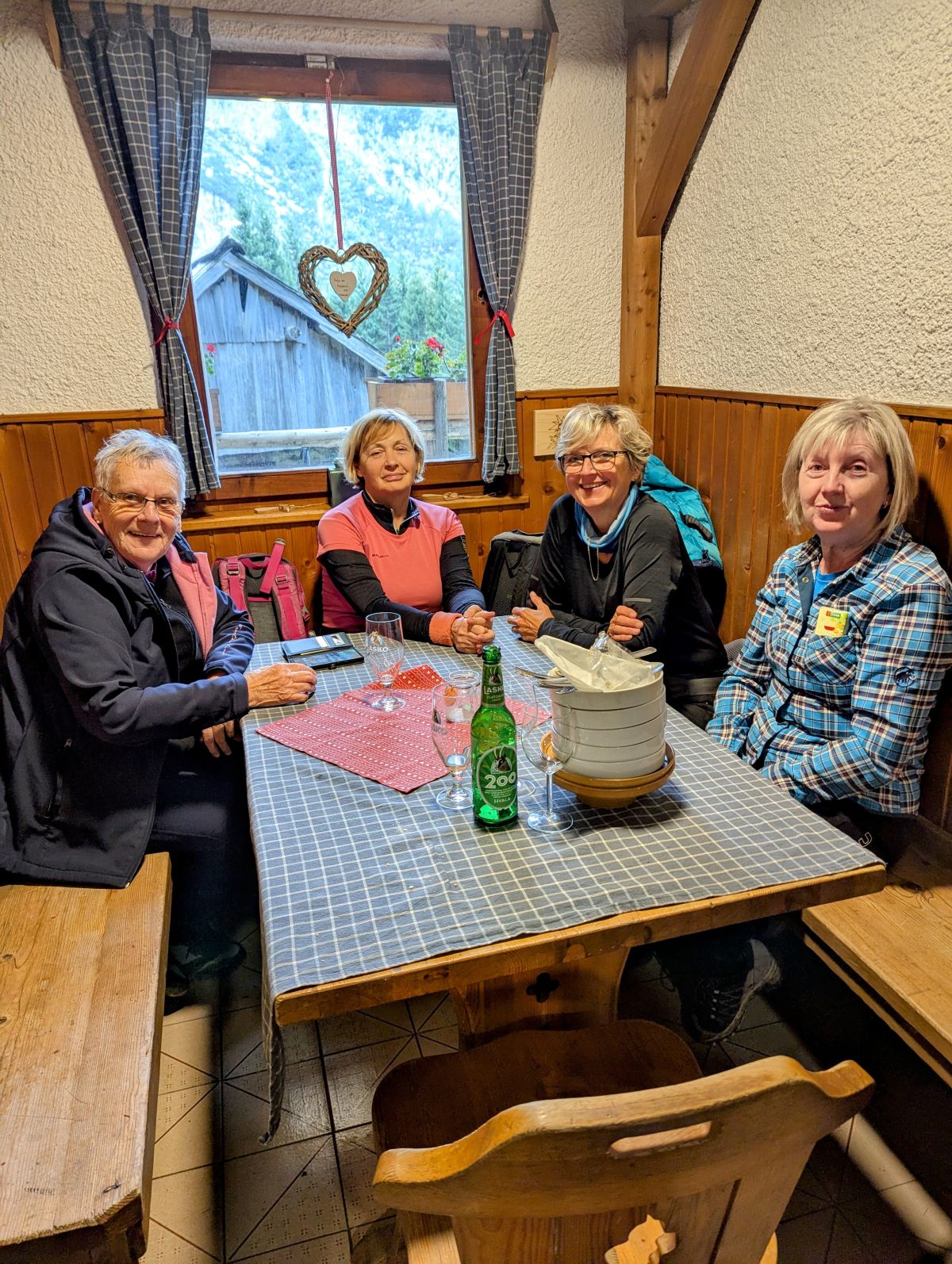 V planinski koči na Klemenči jami smo imeli daljši počitek. Oskrbnik koče nam je pripravil okusno joto, pasulj, ciganski golaž in neko vrsto gobovih raviolov s parmezanom. Vse je bilo zelo okusno in poceni. Ker je planinska koča manjše kapacitete, so nekateri pojedli hrano pred kočo, potem pa so se prišli ogret k topli krušni peči. Z oskrbnikom smo naredili še skupinsko fotografijo in začeli s spustom proti Logarski dolini.