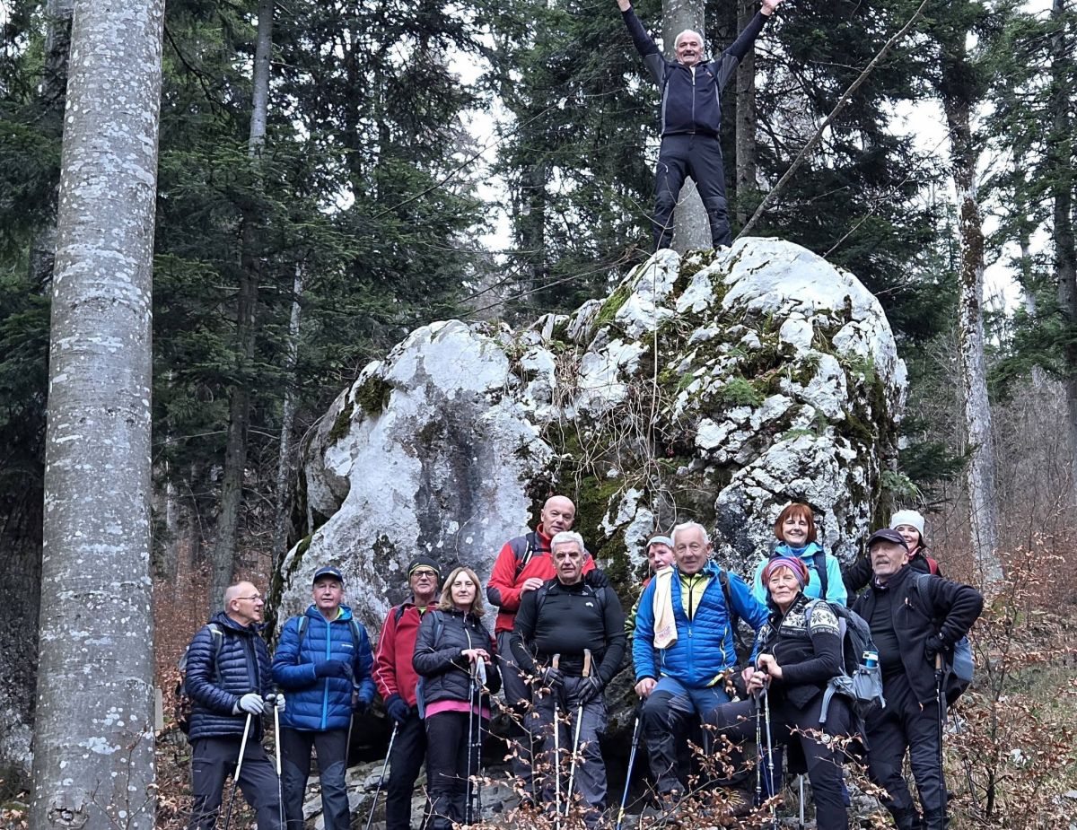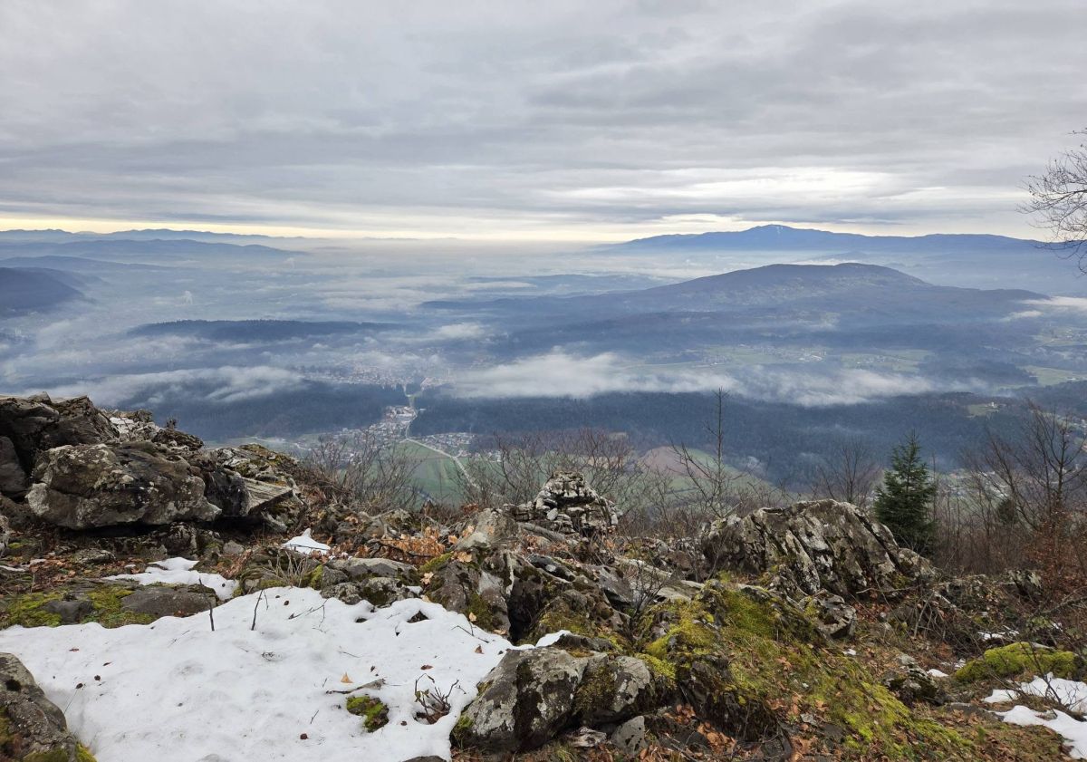 Razgledi do KSA, zasavskih hribov, pod nami topliška in novomeška kotlina, so bili nagrada za trud. Klopca ljubezni je samevala tam na robu. Raje smo pozirali ob čudovitem ozadju, na krpi snega, vsi veseli, medvedjih stopinj ni bilo videti. Za povratek smo izbrali krožno pot, se ustavili ob zanimivi, ogromni skali in Polharskem domu.