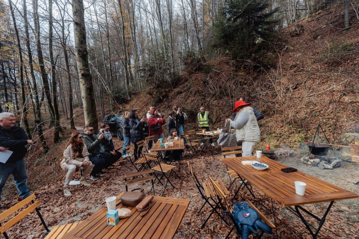 Rebeka Dremelj in Gorka Berden sta že dobro ogreti za prihajajočo predstavo Šminka in sekirca, kar sta dokazali na tiskovni konferenci sredi gozda v občini Škofljica.