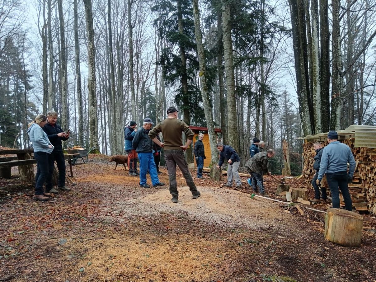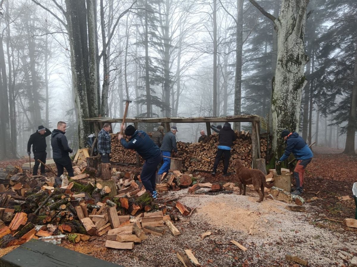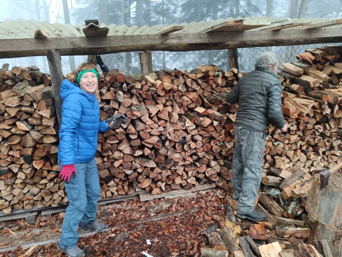 Ko smo se pogovorili o vseh zadevah okoli organizacije in upravljanja zavetišča, smo začeli z delovno akcijo. Besed je počasi zmanjkalo in bil je čas, da zapojejo sekire, da se velike klade drv oklestijo in da se napravijo drva za zimo, ki se hitro bliža. Napravili smo veliko skladovnico drv, pograbili drobir, očistili okolico in poskrbeli za malico.