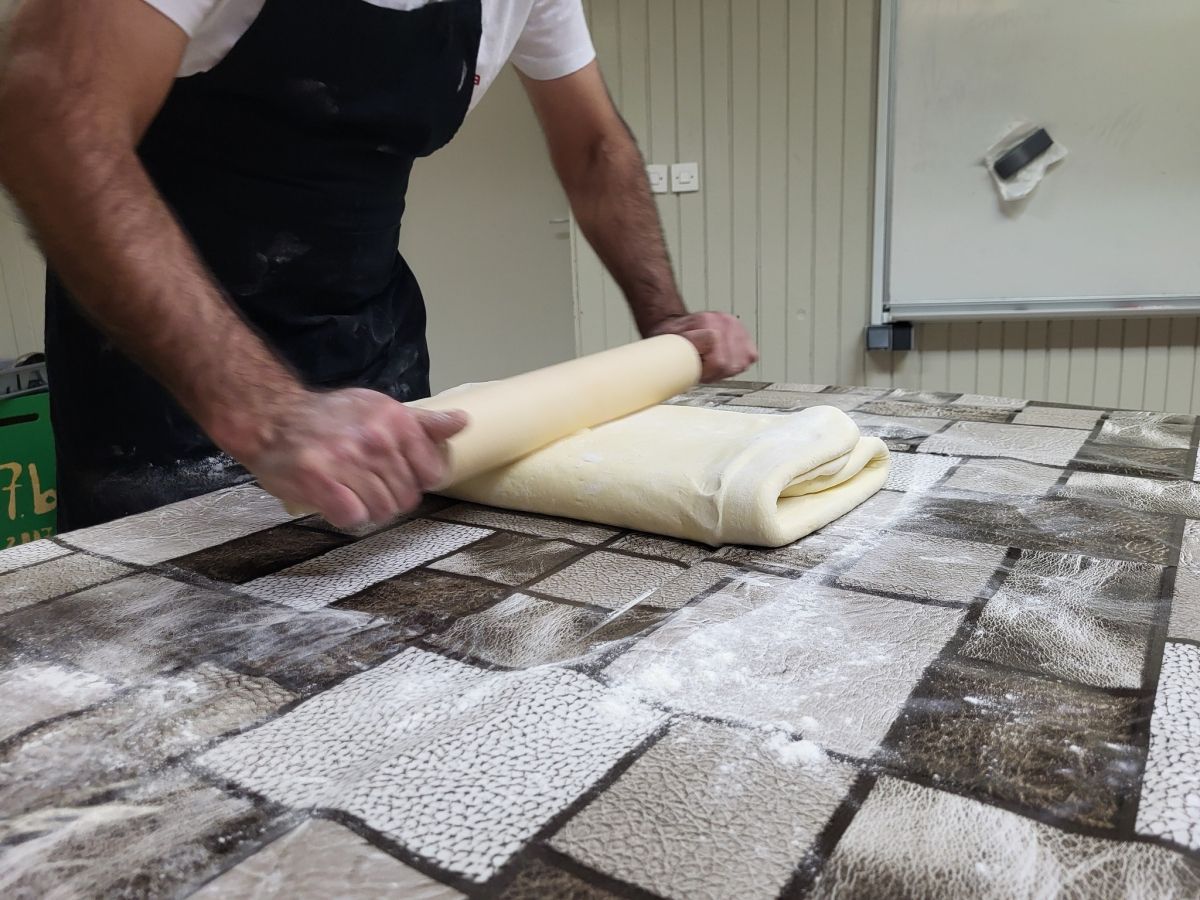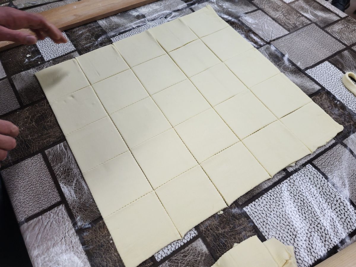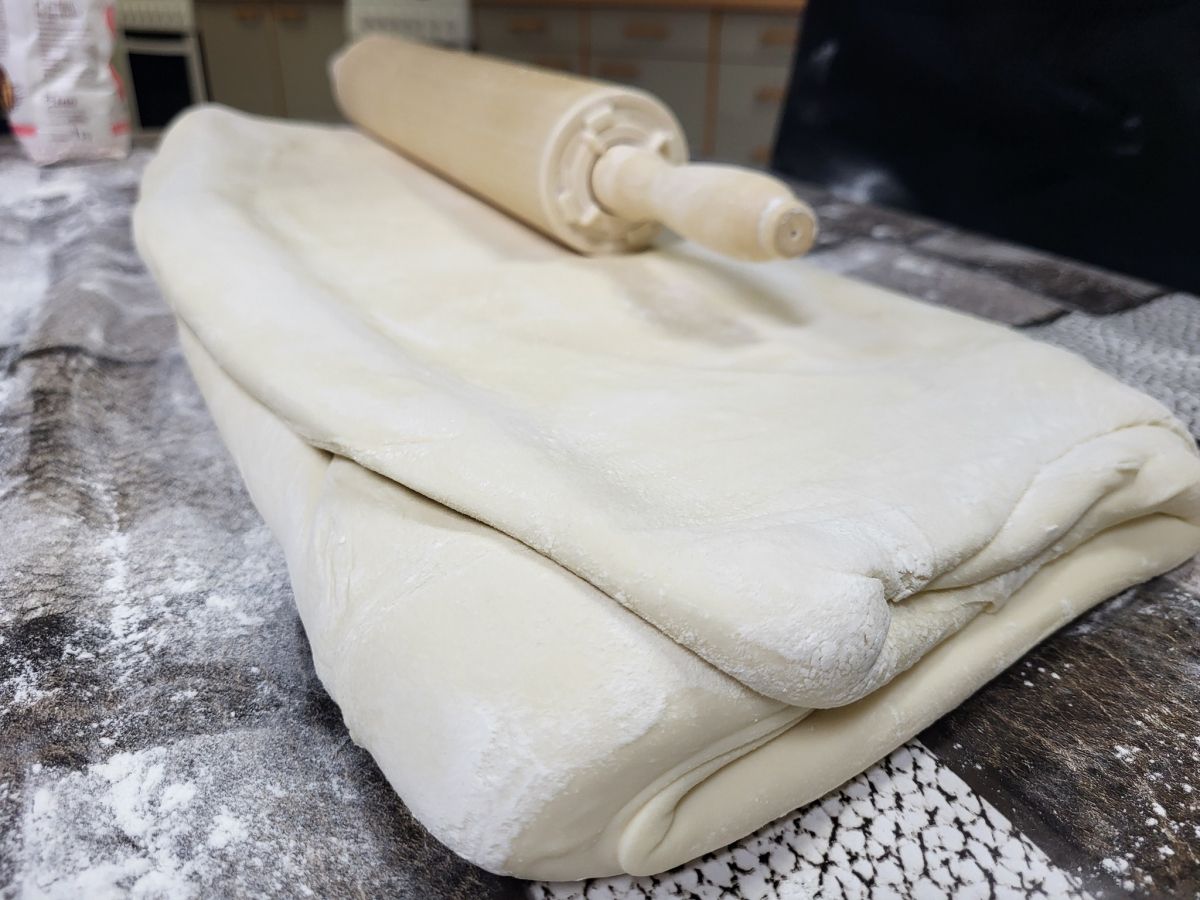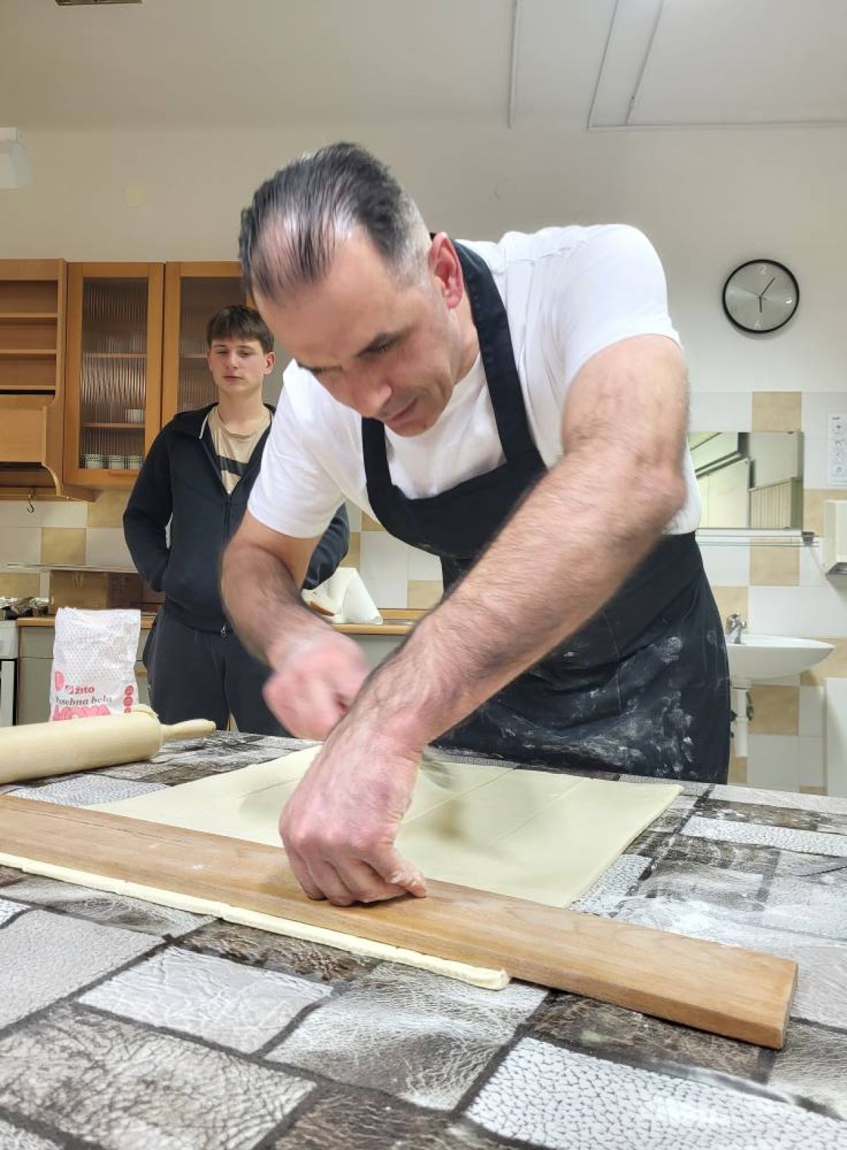 Udeleženci so z zanimanjem spremljali, kako se plasti testa in maščobe lepo zlagajo po slojih oziroma valjajo in nadevajo.