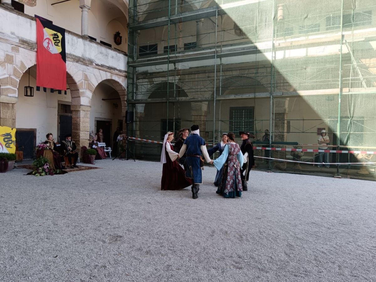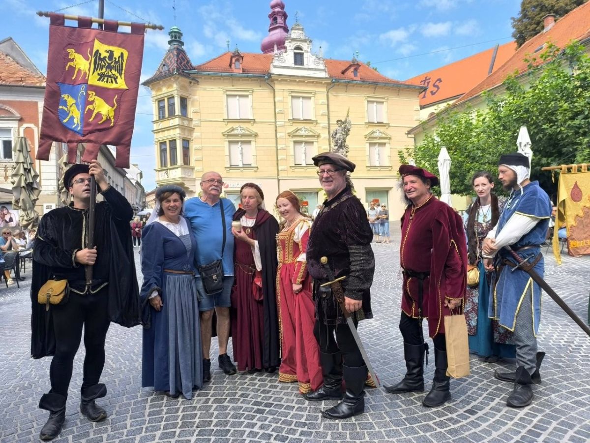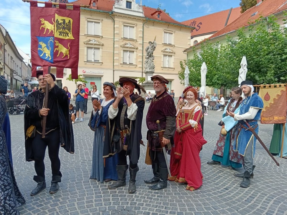 Čas nas je lovil in morali smo nazaj na grad. Mogoče smo tudi mi lovili čas, ker smo prisopihali na najvišji del Ptuja prav na koncu sape. Če bi bilo še pet korakov več, bi se kar ulegel na tla in počakal zvestega oprodo, da me povleče do cilja. Ja, potem bi se mi pa vsi smejali in me vlačili po fejsbuku. Srednji vek je včasih zelo naporen. Treba je vse to zdržati. Potem pa še ples pred knezom in kneginjo, poklon in darila, nazdravljanje s starimi prijatelji iz drugih provinc in predstavitev naše šmarnce.