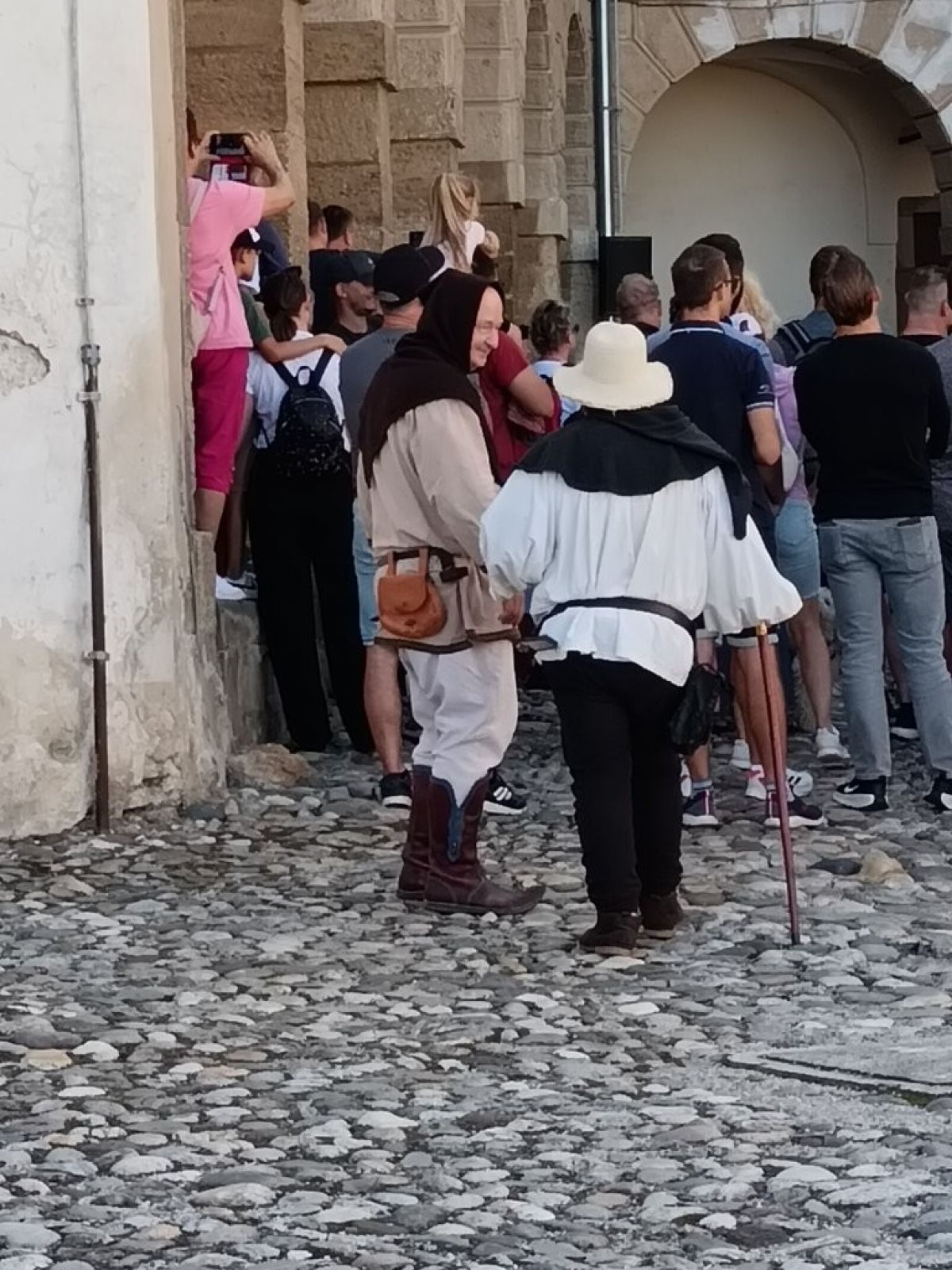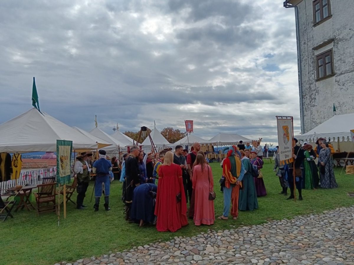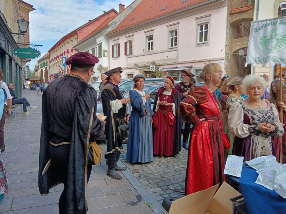 Čas nas je lovil in morali smo nazaj na grad. Mogoče smo tudi mi lovili čas, ker smo prisopihali na najvišji del Ptuja prav na koncu sape. Če bi bilo še pet korakov več, bi se kar ulegel na tla in počakal zvestega oprodo, da me povleče do cilja. Ja, potem bi se mi pa vsi smejali in me vlačili po fejsbuku. Srednji vek je včasih zelo naporen. Treba je vse to zdržati. Potem pa še ples pred knezom in kneginjo, poklon in darila, nazdravljanje s starimi prijatelji iz drugih provinc in predstavitev naše šmarnce.