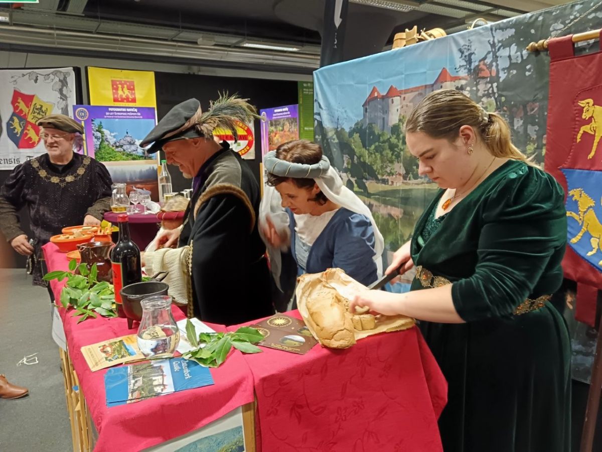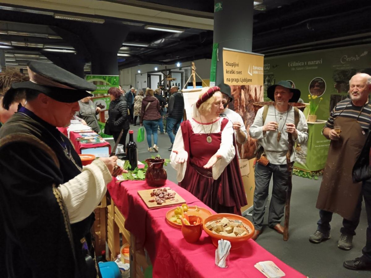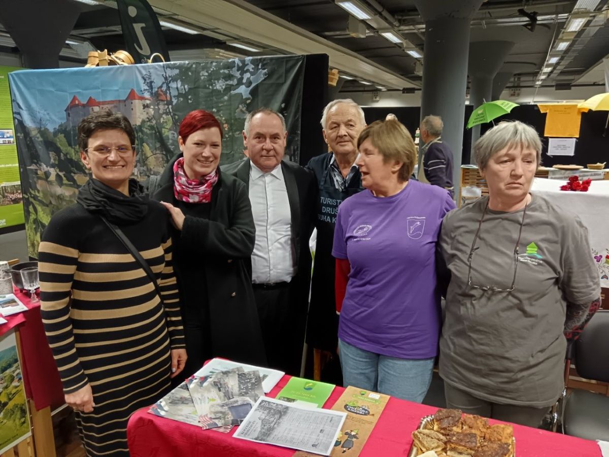 V steberni dvorani so na stojnici obiskovalcem približali svojo Suho krajino, njene naravne znamenitosti, kulinariko in kulturne dogodke, ki potekajo v občini Žužemberk. Prav na tanko so rezali domačo suho salamo in tlačenko iz domače kamre. Ponujali so cviček in druge pijače iz domačih kleti.