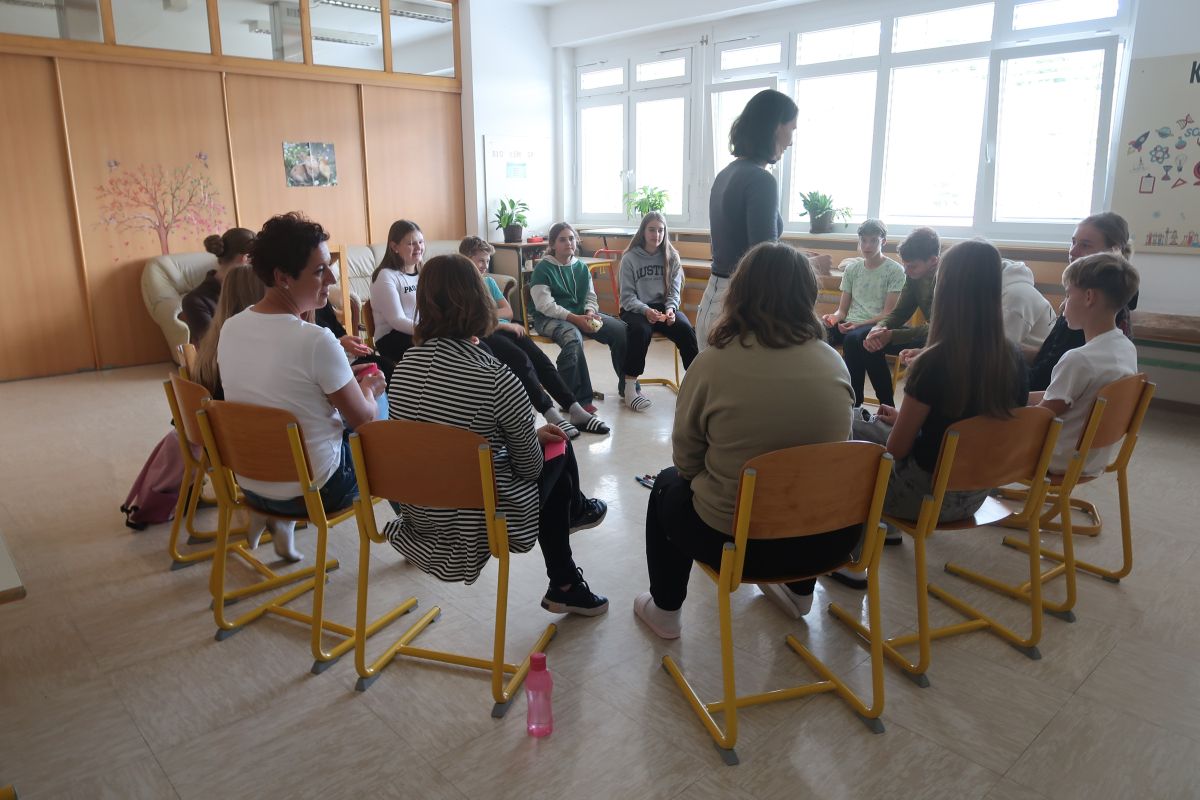 V ponedeljek dopoldne smo izvedli Unescov projekt Učenec poučuje. Naši devetošolci so za dve uri stopili v čevlje učiteljev in se preizkusili v novi vlogi. Odlično jim je šlo. Po kosilu smo ustvarjali z Marjano Gerjevič, se urili v socialnih veščinah z MC Brežice, v torek brali z Andrejo Dvornik iz brežiške knjižnice in igrali badminton s Tadejem Škofom, v sredo nas je obiskala frizerka Jana Strnad, hkrati pa so se učenci pomerili v odbojki z učitelji.