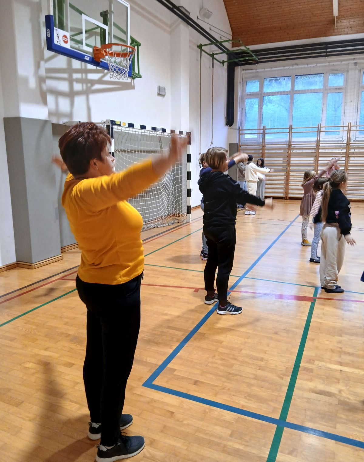 V četrtek nas čaka poligon v telovadnici in ogled filma. Petek bomo zaključili s plezanjem na plezalni steni z Juretom Barbičem in obiskom gasilske postaje Pišece. V sredo zjutraj smo k jutranjemu razgibavanju z učiteljico Sanjo Dornik povabili naše stare starše.
