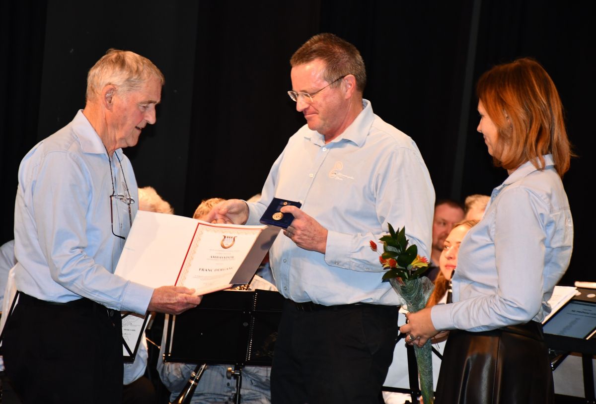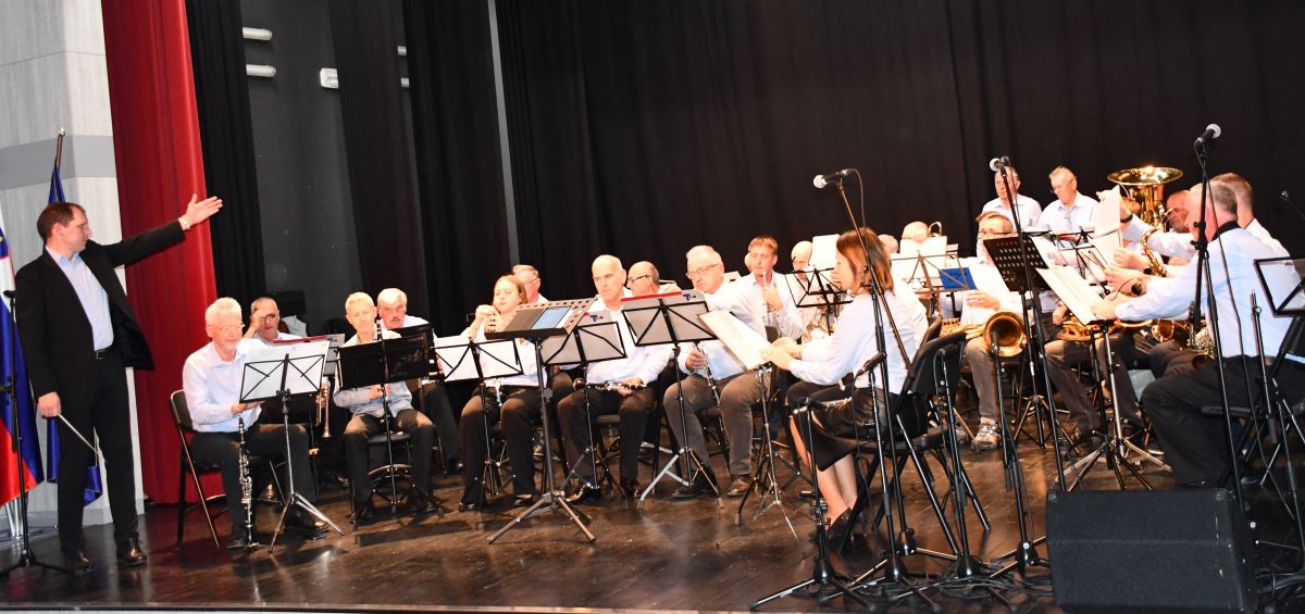 Predsednik društva Samo Jakljič je še enkrat pred domačim občinstvom podelil priznanje ambasadorju godbeništva Francu Dergancu, ki ga je letos prejel že v Mengšu.