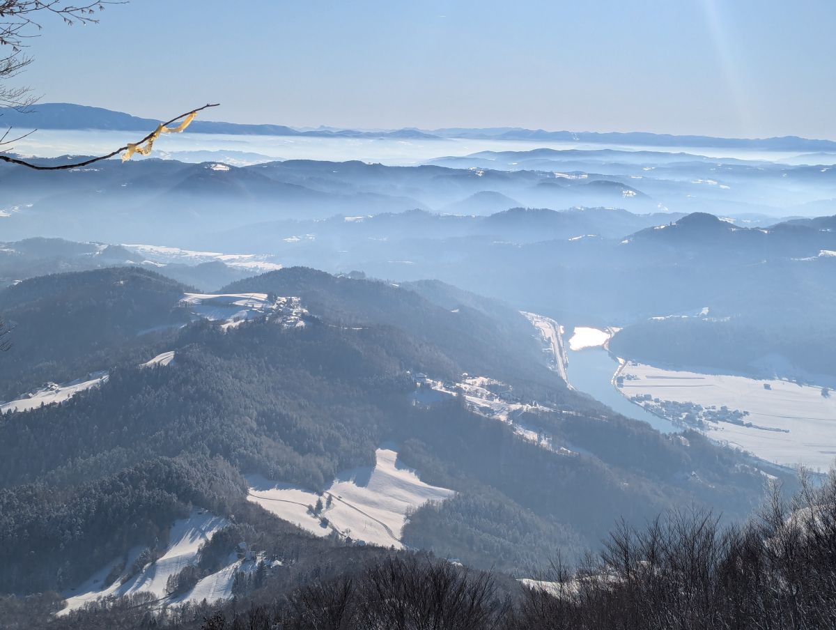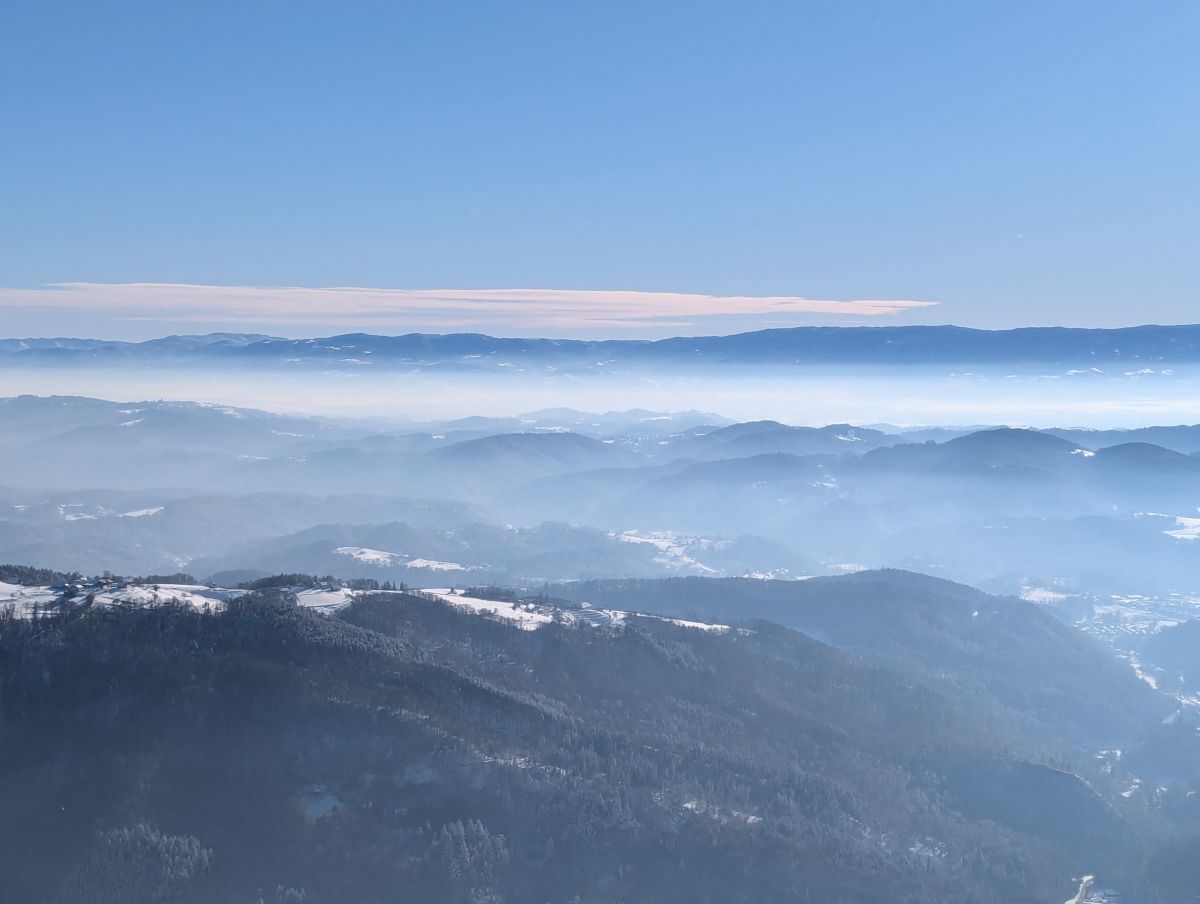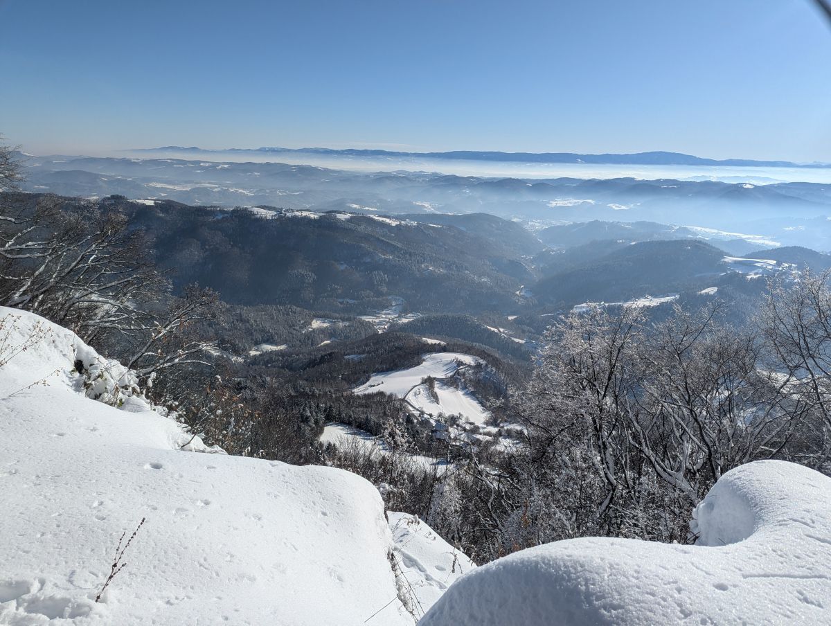 Z vrha se nam je pokazal lep razgled proti severu na Kamniško Savinjske Alpe in Julijske Alpe, proti vzhodu na Donačko Goro in Boč, na jugu na Sljeme in proti zahodu na Gorjance, v ozadju pa na Snežnik. V planinski koči so nam pripravili okusno gobovo juho z ajdovimi žganci, ričet in pasulj. Nekateri so popili še kavo ali čaj. Naši zvesti pohodnici Neži pa smo zapeli in nazdravili za rojstni dan.