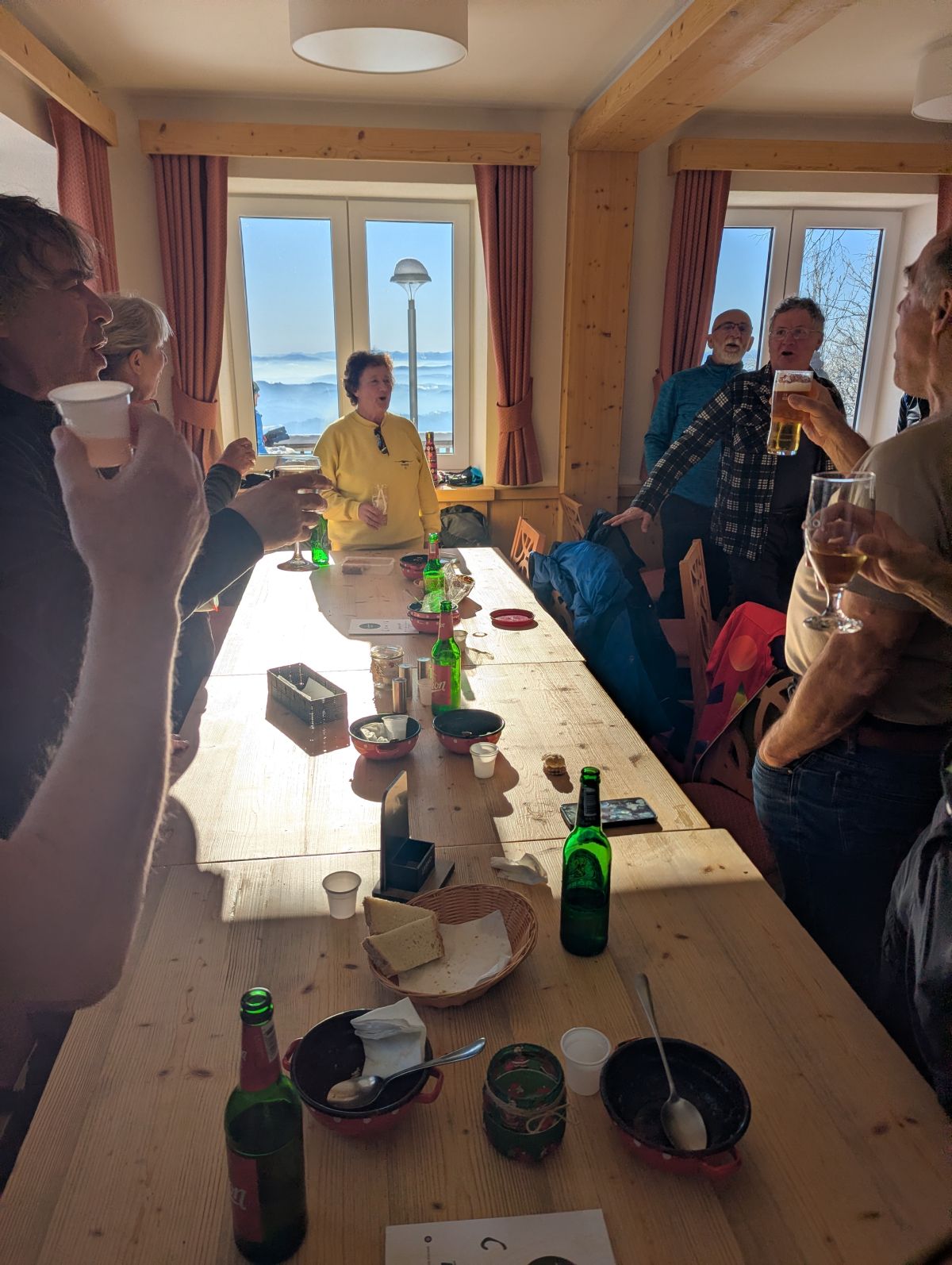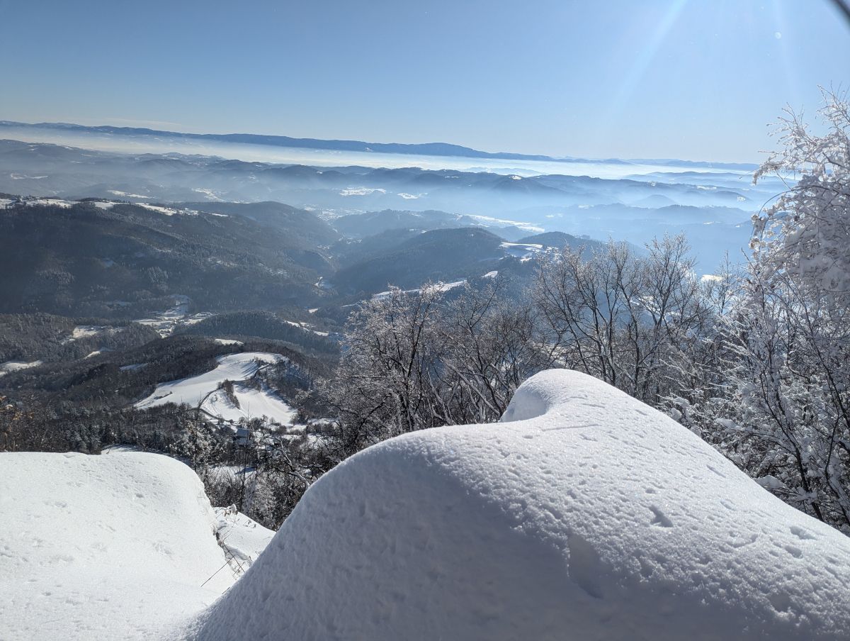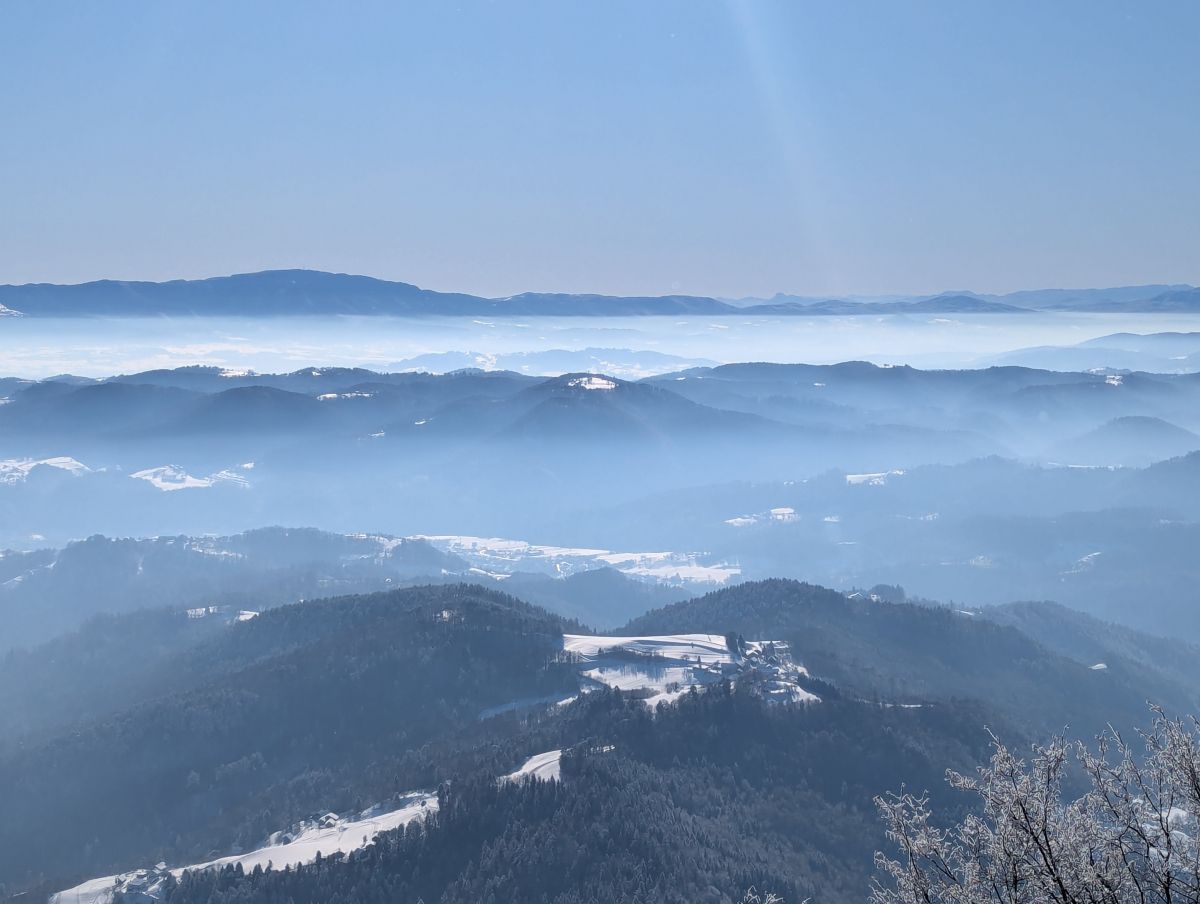 Z vrha se nam je pokazal lep razgled proti severu na Kamniško Savinjske Alpe in Julijske Alpe, proti vzhodu na Donačko Goro in Boč, na jugu na Sljeme in proti zahodu na Gorjance, v ozadju pa na Snežnik. V planinski koči so nam pripravili okusno gobovo juho z ajdovimi žganci, ričet in pasulj. Nekateri so popili še kavo ali čaj. Naši zvesti pohodnici Neži pa smo zapeli in nazdravili za rojstni dan.