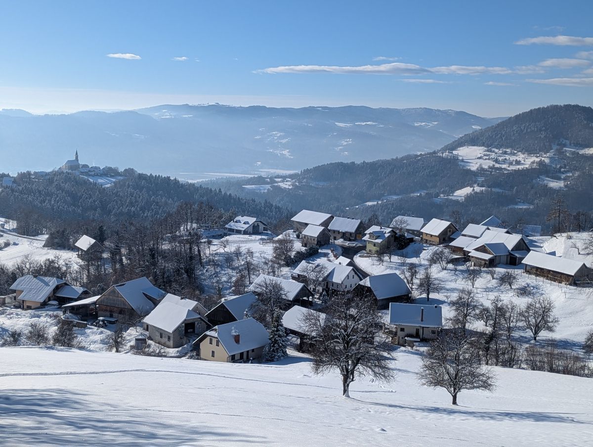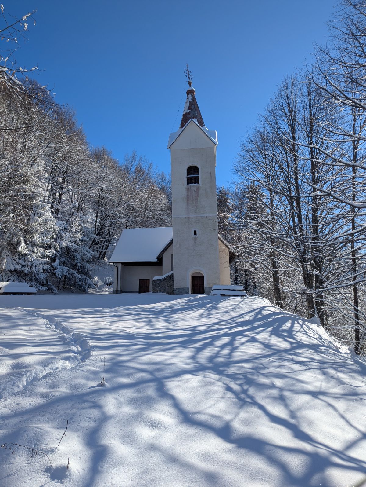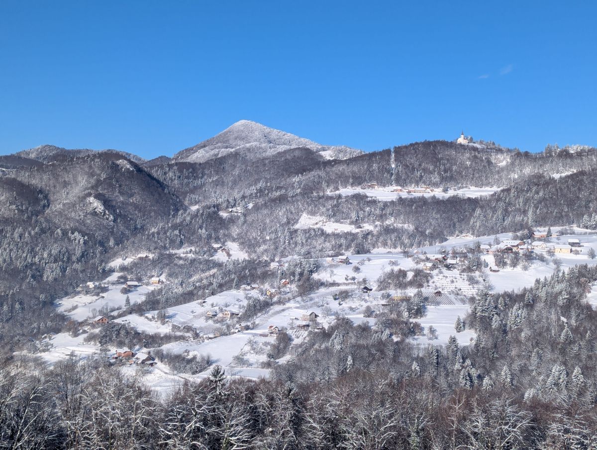 Nadaljevali smo po strmi gozdni poti, na kateri smo se večkrat ustavili in počakali, da se je dolga kolona zopet združila. Malo daljši počitek smo imeli ponovno pri cerkvi Sv. Jošta, kjer smo se malo osvežili s toplim čajem. Po dobrih treh urah smo tako prišli na veliki travnik, s katerega smo zagledali vrh Lisce in Tončkov dom. Nekaj se nas je odločilo, da se povzpnemo še na vrh, ostali pa so odšli v planinsko kočo.