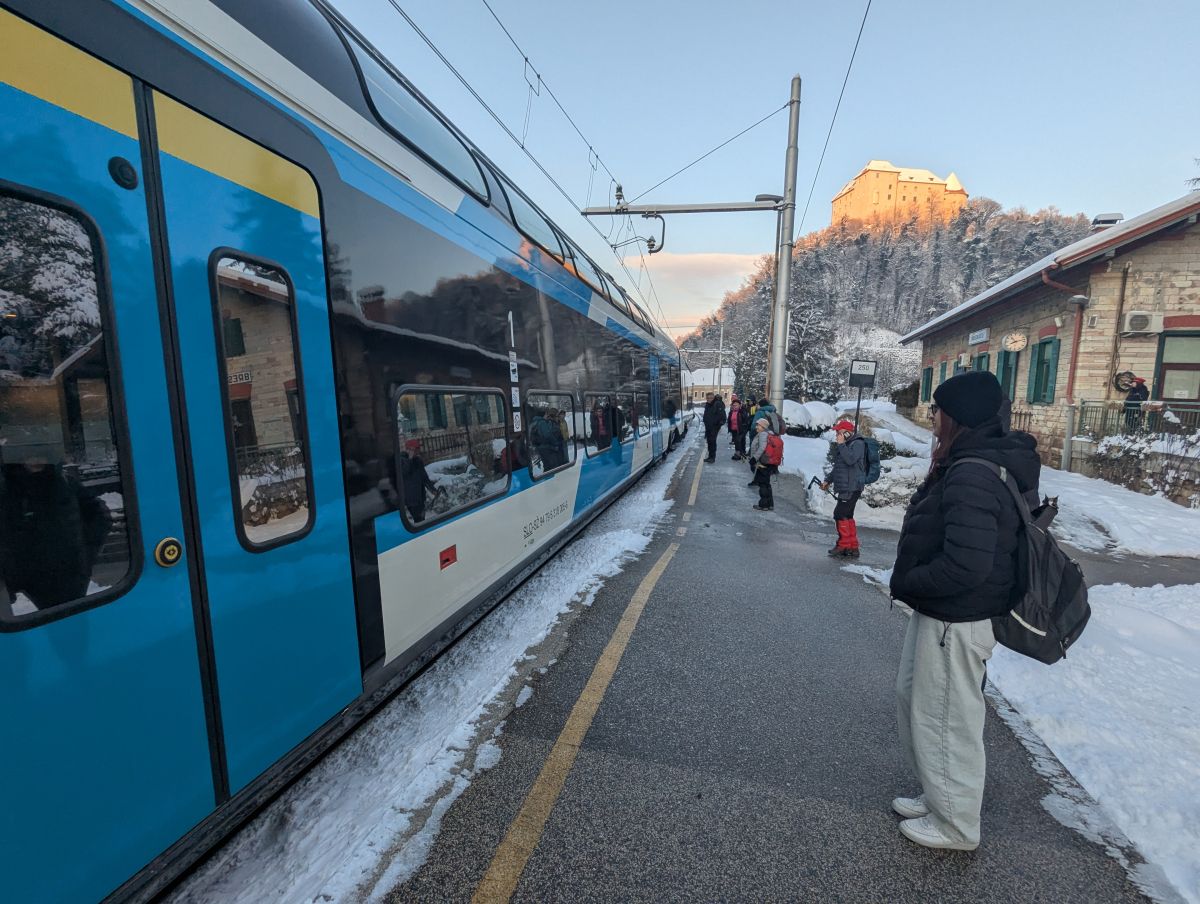 Ob jutranjih -15 stopinj celzija na Železniški postaji v Brestanici in 40 minutni zamudi vlaka smo v ogrevani čakalnici optimistično dobro razpoloženi počakali vlak. Na peronu smo opazovali grad Rajhenburg, ki so ga že obsijali sončni žarki. Iz reke Save pa so se dvigale hladne meglice.