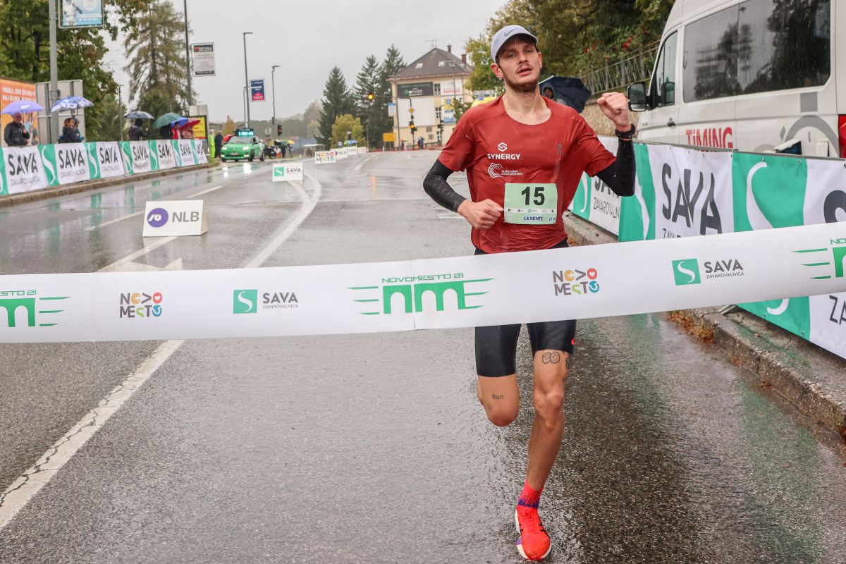 Kljub dežju in hladnemu vremenu je zmagovalec Novomeškega polmaratona Madžar Levente Szemerei dosegel imeniten čas 1:04:49.